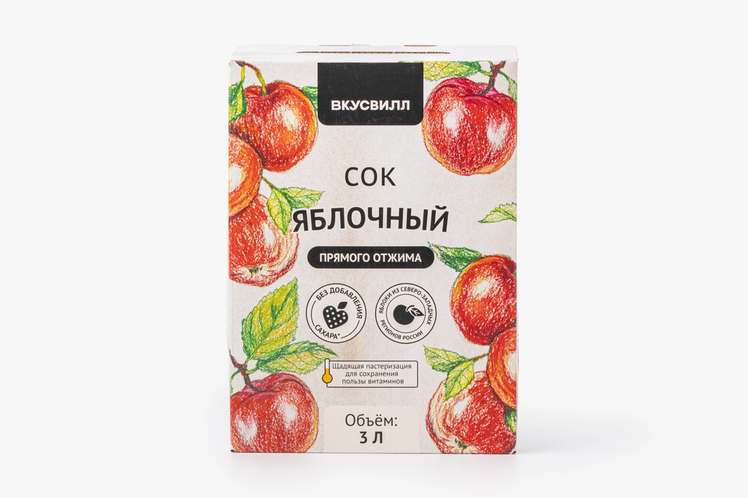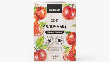 Сок прямого отжима из свежих яблок. Без добавленного сахара и других дополнительных ингредиентов. С ярким кисло-сладким вкусом и выразительным ароматом. Подходит детям от 3 лет. Если вкратце описывать процесс изготовления, то фрукты моют и перебирают, измельчают, подают на пресс, полученный сок фильтруют, пастеризуют щадящим методом и разливают. Всё. Можно сказать, что это практически тот же свежевыжатый сок, только в пакете.