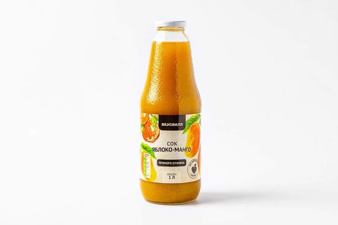 Соединили сок прямого отжима из яблок, добавили манговое и яблочное пюре — и это весь состав. Не используем для приготовления консервантов, искусственных красителей или ароматизаторов