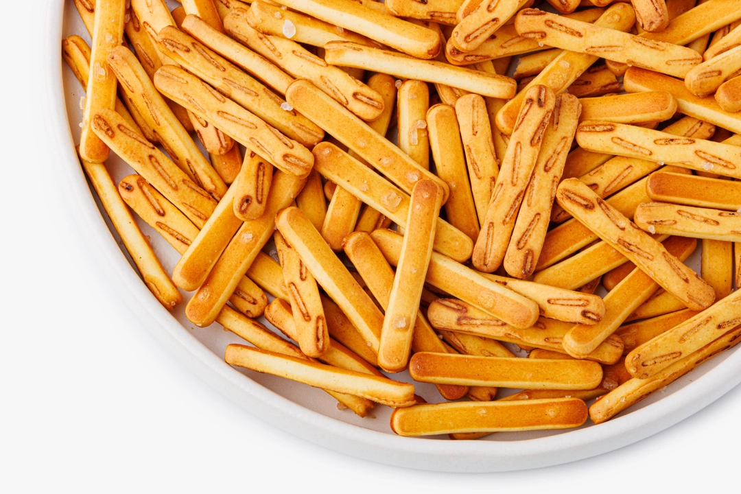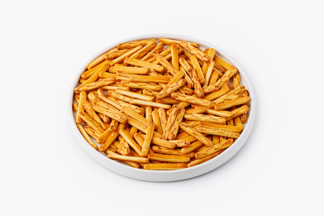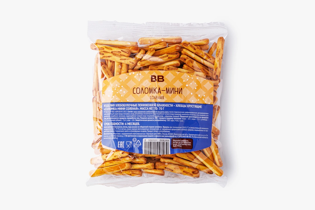 Тонкая и хрустящая соломка из пшеничного теста с лёгким посолом. Она золотистая и рассыпчатая, с приятным нейтральным вкусом. Удобно взять с собой на прогулку или в дорогу для перекуса.