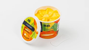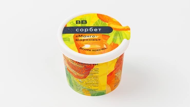 Яркий сорбет с солнечным вкусом: здесь сладкое пюре манго сочетается с морковью, создавая интересный и сбалансированный дуэт. Манго отвечает за тропическую ноту и сочность, а морковь — за плотную текстуру и мягкую сладость с лёгким растительным оттенком. Текстура гладкая, плотная, без крупных кристаллов. Десерт получается освежающим и необычным — подойдёт тем, кто не боится новых вкусовых сочетаний. Порция компактная, с ложечкой внутри — удобно взять с собой или съесть на ходу.
