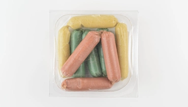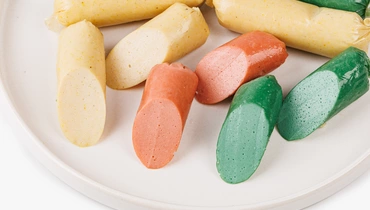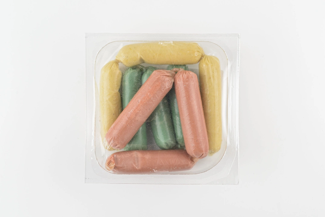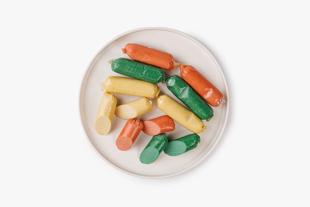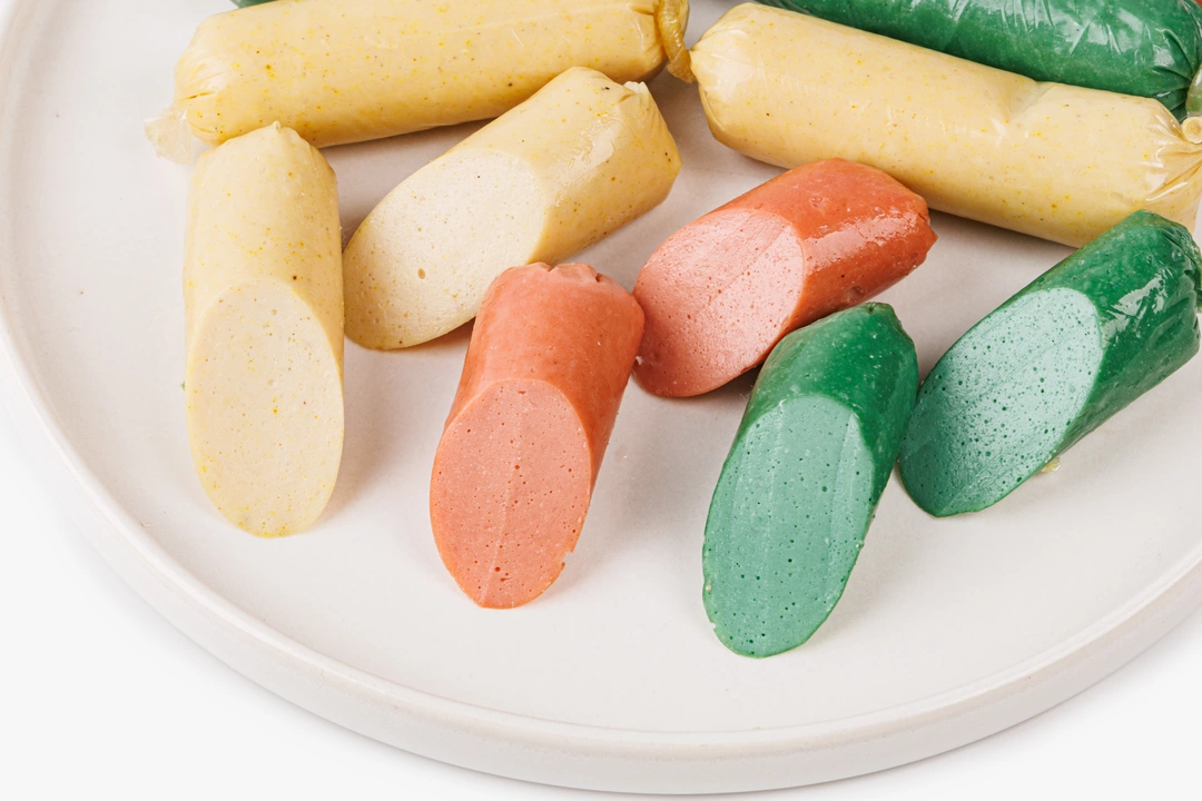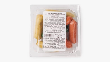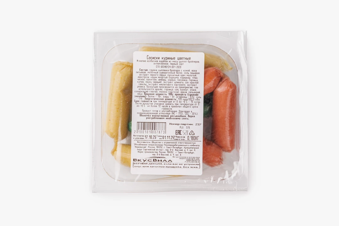 Разноцветные куриные сосиски с нежным вкусом. Приготовлены из филе куриной грудки с добавлением молочного белка и натуральных красителей из шпината, свёклы и фиолетового картофеля. Щепотка специй придаёт им тёплую пряную ноту. Такой продукт понравится всей семье, сосиски можно подать с картофельным пюре или яичницей — необычный цвет добавит ярких красок любому блюду.