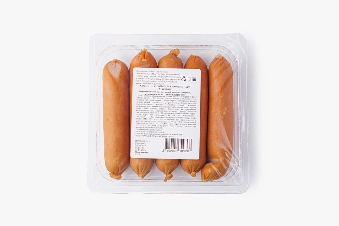 Нежная основа из свинины и говядины, сливочно-сырный привкус и элегантная пикантно-грибная нота. Ароматное трюфельное масло любому блюду добавит утончённости. Вот и эти сосиски из просто вкусных превратились в изумительные. Можно подать с гарниром, приготовить хот-доги или слегка обжарить и подать как закуску.
