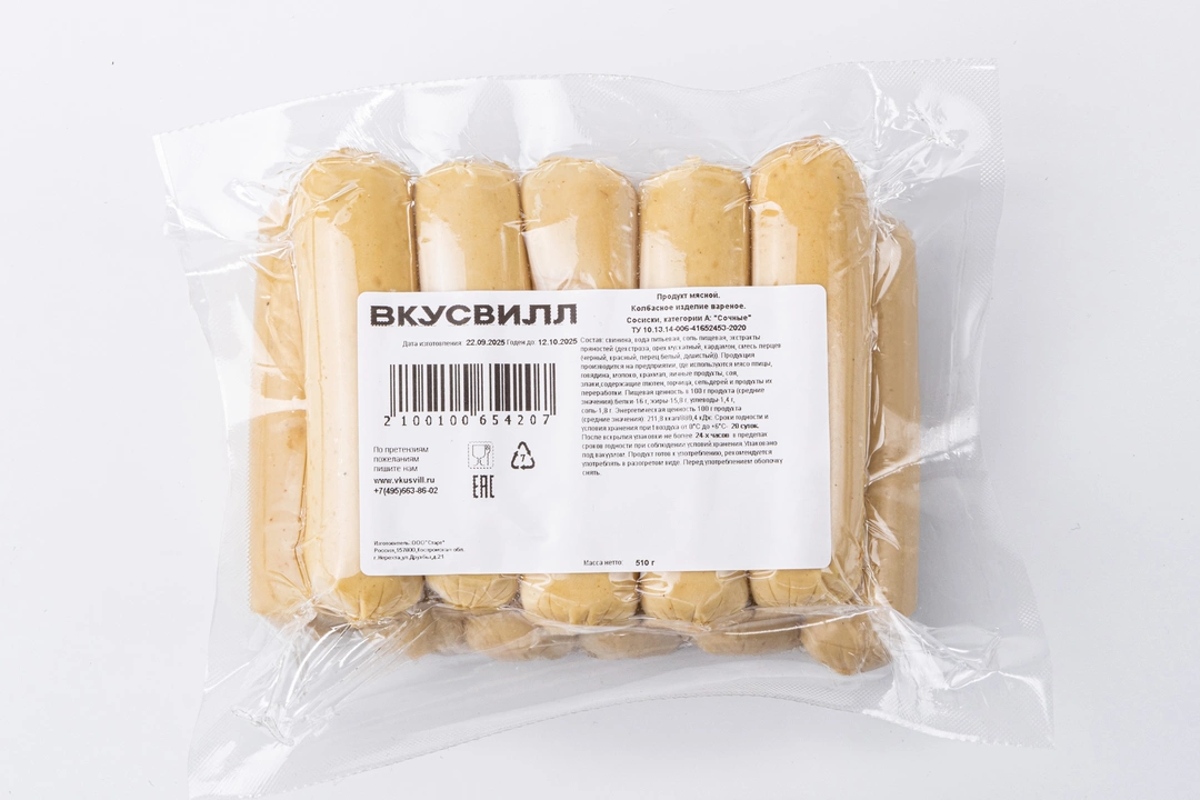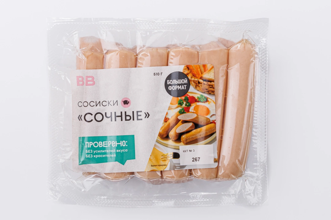 Подкопчённые, умеренно жирные сосиски из свежей свинины. Изготовлены с добавлением душистого кориандра и кардамона, мускатного ореха, чёрного и красного перца. Такие питательные и сытные сосиски можно отварить на завтрак, обжарить с яичницей, овощами или маринованной капустой, сочинить с ними домашний хот-дог или даже добавить в наваристый супчик.