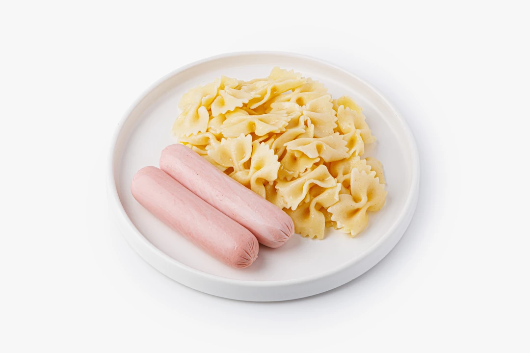 Нежные сосиски из растительных ингредиентов с классическими макаронами-бабочками. Фарфалле из твёрдых сортов пшеницы отварены и заправлены подсолнечным маслом. Сосиски дополняют блюдо едва заметными нотами мускатного ореха и душистого чёрного перца. Перед подачей на стол его нужно слегка подогреть. Это лёгкая версия простого традиционного ужина, которую оценят те, кто не употребляет пищу животного происхождения. Блюдо можно дополнить рубленой зеленью и томатным соусом для ещё большей аутентичности.