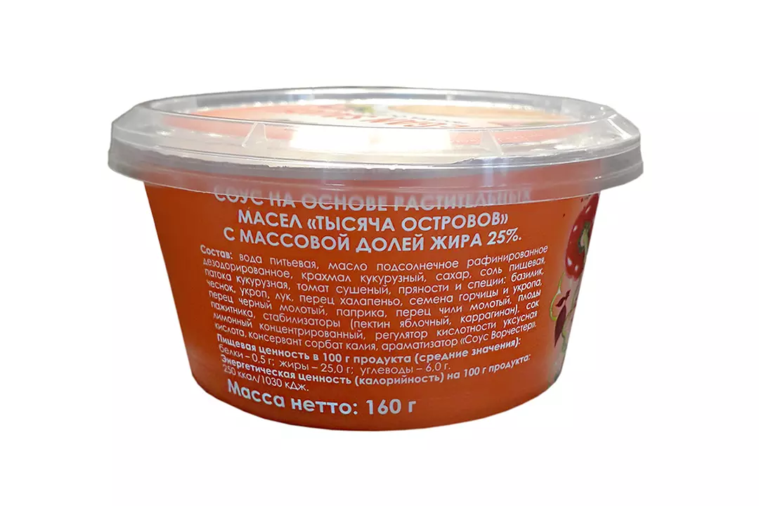 Нежный соус «Тысяча островов» на основе растительных масел подходит для веганского и постного меню, а также для тех, кто имеет особые ограничения, такие как непереносимость глютена или лактозы. Попробуйте вместе с печеным или жареным картофелем, сочными овощами или хрустящим фалафелем. Добавьте вкуса и сочности вашим блюдам. Страна-производитель Россия