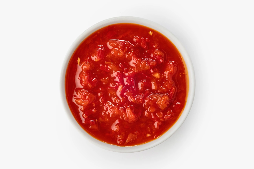 Густой овощной соус на основе красного перца с добавлением свежего чеснока и кориандра. Вкус яркий, пряный, с ощутимой перечной остротой и выраженным овощным характером. Текстура плотная, однородная — соус удобно наносить тонким слоем на хлеб или добавлять в блюда. Подходит к мясу, птице и овощам, хорошо работает как заправка для тёплых блюд или основа для маринада. Можно добавлять небольшими порциями, регулируя насыщенность вкуса.