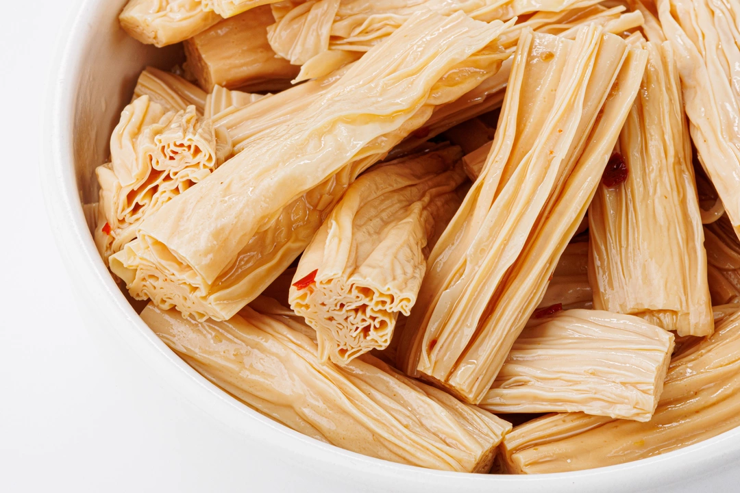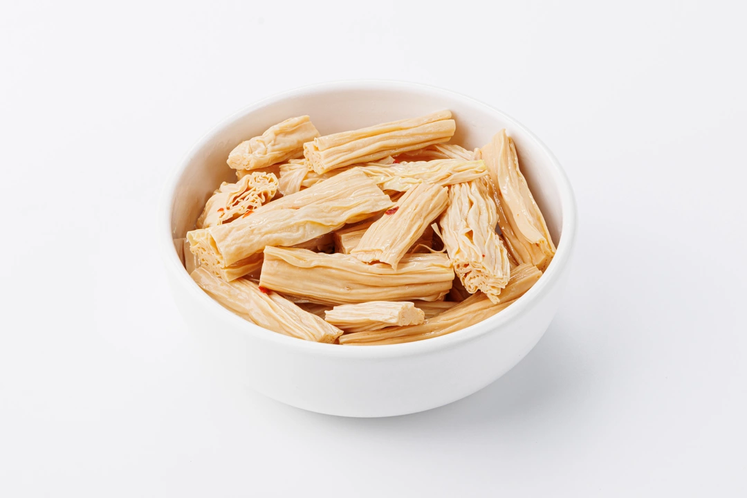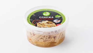 Салат «Спаржа по-корейски» это пикантная закуска для любителей корейской кухни. В салате восстановленная спаржа, удачно сочетается с композицией из специй. Соевая спаржа (или фучжу)— это уникальный растительный продукт переработки соевых бобов, который производится из соевого молока и представляет собой пенку, собранную с кипяченого соевого молока. Полезна благодаря высокому содержанию белка, витаминов (B, E, D), минералов (калий, железо, кальций, магний) и клетчатки. Она способствует нормализации работы кишечника, выведению токсинов, улучшению гормонального фона у женщин, профилактике сердечно-сосудистых заболеваний, а также помогает в диетах для снижения веса и нормализации уровня холестерина и сахара в крови. Этот салат гармонично сочетается как со свежими, так и с отварными овощами, а также с мясом и рыбой. Страна производитель-Россия