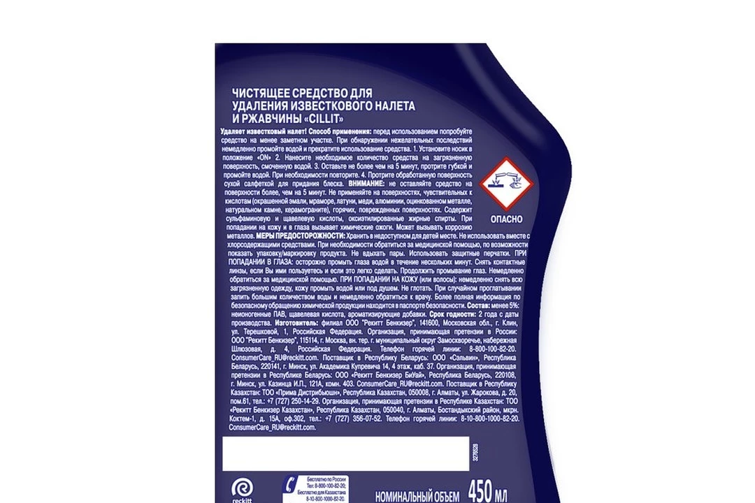 Чистящий спрей Cillit для удаления известкового налета и ржавчины. Средство Cillit очищает поверхности в ванной комнате до блеска, а также удаляет известковый налет и ржавчину. Идеально подходит для поддержания чистоты в ванной. Страна-производитель Россия