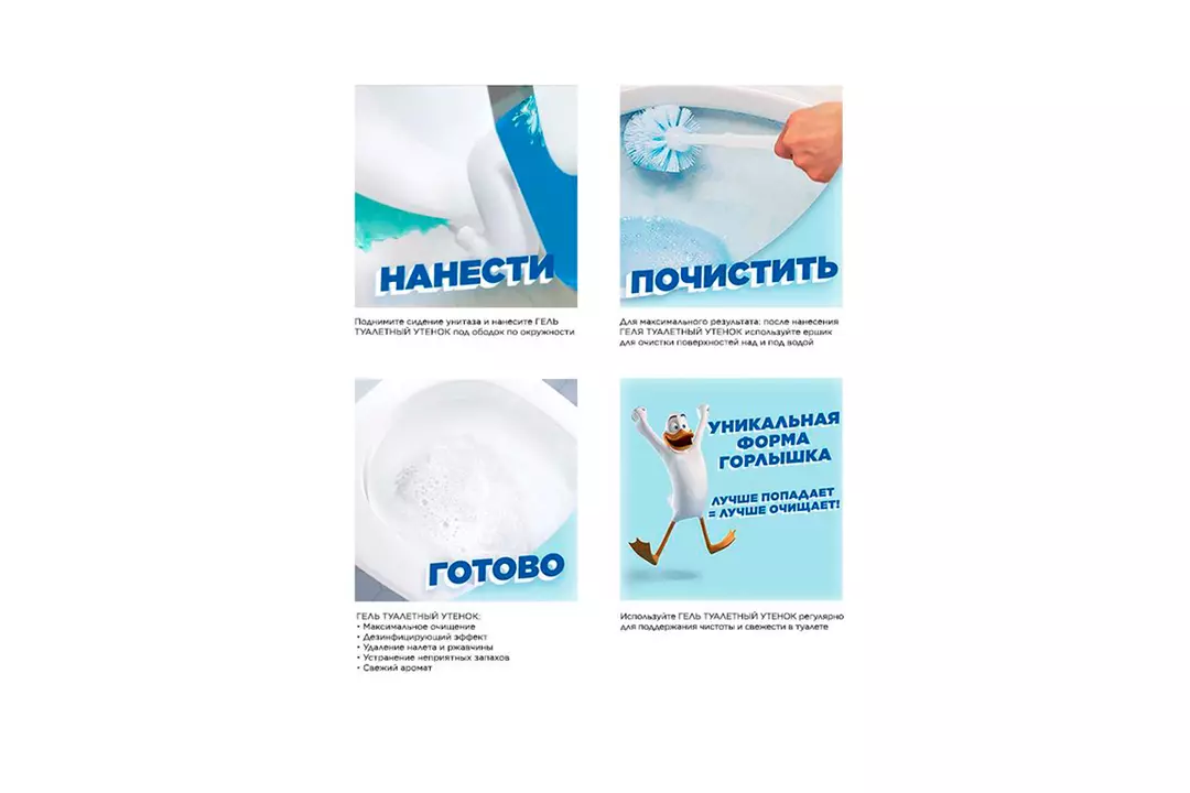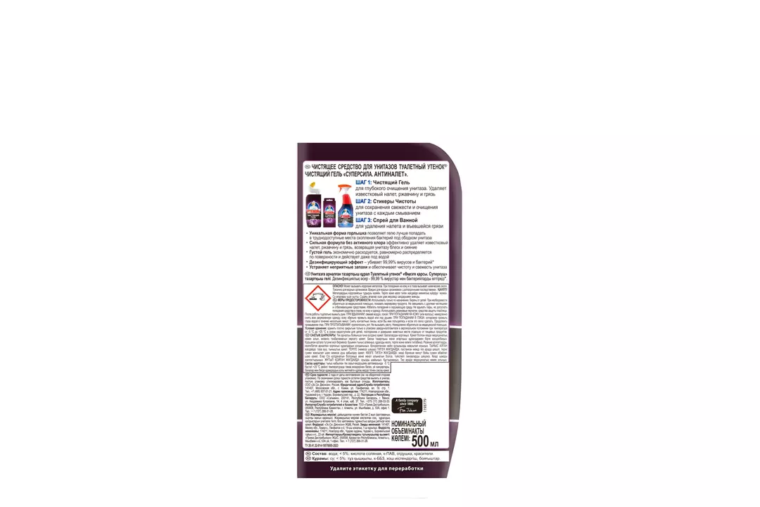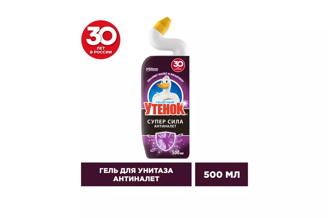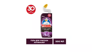 Туалетный Утенок Чистящее средство для унитазов Антиналет обеспечивает бескомпромиссную чистоту и свежесть унитаза, эффективно удаляет известковый налет и ржавчину, без хлора в составе. Уникальная форма горлышка позволяет гелю лучше попадать в труднодоступные места скопления бактерий под ободком унитаза. Обладает дезинфицирующим эффектом - убивает 99,99% вирусов и бактерий. Устраняет неприятные запахи. Гель экономично расходуется, равномерно распределяется по поверхности и действует даже под водой. Чистящее средство Туалетный Утенок необходимо применять только для очищения унитаза. Попробуйте также Стикеры Чистоты от Туалетного Утенка для поддержания чистоты и свежести в туалете! Страна-производитель Россия