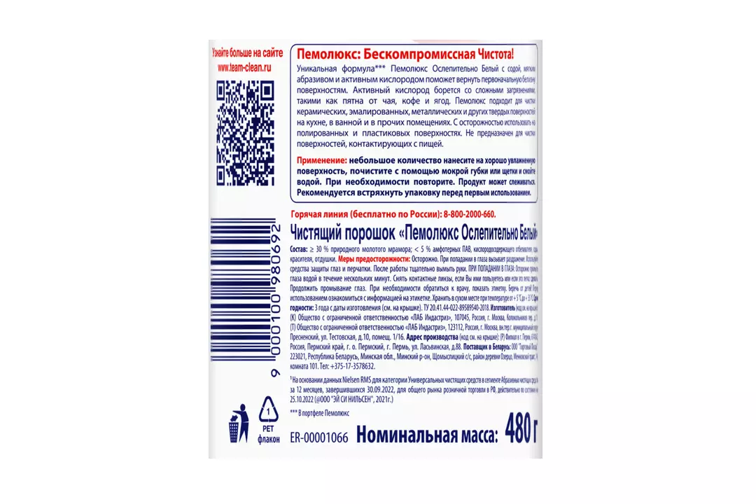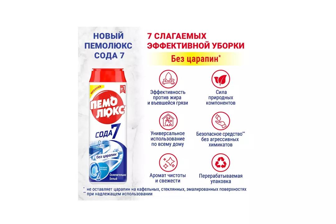Чистящий порошок Пемолюкс - универсальное средство для уборки дома. Порошок Пемолюкс Сода 7 Ослепительно Белый — это быстрая и эффективная уборка. - Пемолюкс не оставляет царапин во время уборки*. - Активный кислород в составе борется со сложными загрязнениями. - Средство эффективно борется с въевшейся грязью и жиром на любых поверхностях. - Формула порошка Пемолюкс имеет натуральную основу и силу природных компонентов. - Средство поможет навести чистоту во всех бытовых помещениях. - Порошок не содержит агрессивных химикатов, безопасен для посуды и кожи человека. - Средство Пемолюкс дарит дому приятный аромат чистоты и свежести. - Перерабатываемая упаковка. * на кафельных, стеклянных, эмалированных поверхностях Порошок Пемолюкс – бренд номер 1 в России**, эффективен и не оставляет царапин*. Эффективная и безопасная уборка – легко вместе с Пемолюкс! * на кафельных, стеклянных, эмалированных поверхностях ** На основании данных NielsenIQ RMS для категории Универсальных чистящих средств в сегменте Абразивных чистящих средств за 12 месяцев, завершившихся 31 декабря 2023 года, для общего рынка розничной торговли в Российской Федерации, действительно по состоянию на 06.02.2024 (©️ ЭЙ СИ НИЛЬСЕН, 2024г.) Производитель ООО ЛАБ Индастриз. Россия