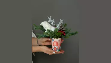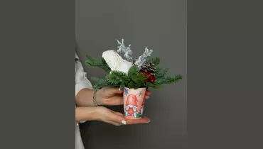 Этот очаровательный зимний декоративный стаканчик – миниатюрное воплощение новогоднего и рождественского волшебства! Созданный для того, чтобы согреть ваш дом теплом праздника, он станет прекрасным украшением интерьера или оригинальным подарком. В основе композиции – изысканная половинка ветки благородного нобилиса, известного своим стойким хвойным ароматом и насыщенным зелёным цветом. Нежная половинка заснеженного рускуса добавляет композиции легкости и воздушности, подчеркивая зимнюю тематику. Шишка, украшенная блеском инея, и яркие декоративные ягодки вносят нотки природной красоты и праздничной жизнерадостности. Центральное место в композиции занимает изящный елочный шарик, добавляющий блеск и праздничное настроение. Вся эта красота бережно собрана в стильном декоративном стаканчике и закреплена на оазисе, что обеспечивает долговечность и сохранение свежести хвои. Композиция имеет высоту 20 см и ширину 17 см, что делает её идеальным украшением для подоконника, стола или камина. Подарите себе или своим близким частичку зимней сказки! Этот декоративный стаканчик наполнит ваш дом праздничным ароматом и создаст незабываемую атмосферу Рождества и Нового года.