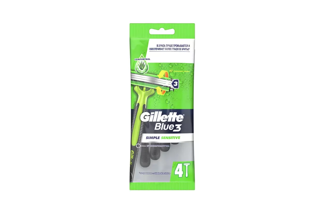 До 10 процедур бережного бритья одной одноразовой бритвой? Это возможно вместе с высокоэффективной одноразовой мужской бритвой Gillette Blue3 Simple Sensitive с 3 независимо подвешенными лезвиями, которые при движении адаптируются к поверхности кожи для гладкого и комфортного бритья. Ее улучшенная смазывающая полоска с активируемой водой технологией Comfortgel делает процедуру невероятно бережной. ПРЕИМУЩЕСТВА: • Бритва Gillette Blue3 Simple Sensitive обеспечивает более качественное бритье с меньшим числом царапин и порезов; • Благодаря открытой архитектуре бритву легко промывать; • Бритва имеет нескользящую прорезиненную ручку для лучшего контроля; • Улучшенная смазывающая полоска Comfortgel обеспечивает гладкое скольжение; • Специальные защитные микрогребни помогают натянуть кожу и подготовить волоски к срезанию; • Нескользящая прорезиненная ручка для лучшего контроля; • Плавающая головка с углом наклона 40° повторяет контуры лица. Бритва Blue3 Simple Sensitive от Gillette обеспечит вам гладкость кожи, заметную для окружающих. Бритва имеет нескользящую прорезиненную ручку для лучшего контроля и на 100% легче промываемые лезвия. Бритва Gillette Blue3 Simple Sensitive обеспечивает более качественное бритье с меньшим числом царапин и порезов. Бритва имеет нескользящую прорезиненную ручку для лучшего контроля. Улучшенная смазывающая полоска Comfortgel обеспечивает гладкое скольжение. Плавающая головка с углом наклона 40° повторяет контуры лица. Бритва Blue3 Simple Sensitive от Gillette обеспечит вам гладкость кожи, заметную для окружающих.