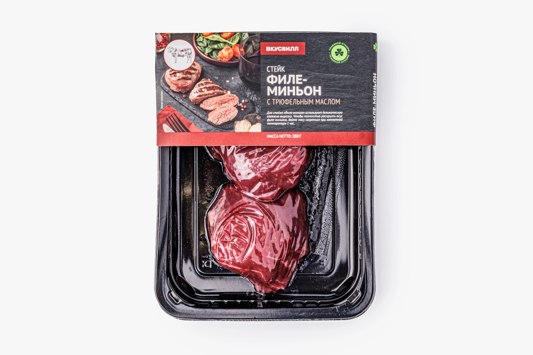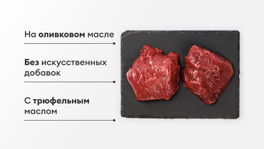 Деликатесный стейк из мраморной говядины. Прекрасный сам по себе, в сочетании с трюфельным маслом стейк Филе Миньон превращается в подлинный гастрономический шедевр. Это мясо отличает насыщенный вкус и нежная мякоть. Трюфель придаёт аромату стейка ни на что не похожие дерзко-пряные ноты, а его вкусу — тонкую гурманскую пикантность. Чтобы ужин получился незабываемым, дайте мясу прогреться при комнатной температуре в течение получаса. Как готовить: • На сковороде. Обжарьте на среднем огне по 3 минуты с каждой стороны. Затем готовьте на слабом огне в течение 14–20 минут, переворачивая каждые 2 минуты. Длительность зависит от желаемой степени прожарки. Выложите стейки на фольгу, по желанию добавьте специи, плотно заверните и оставьте на 3 минуты. • На углях. Жарьте на средних углях в течение 14–18 минут, переворачивая каждую минуту. Выложите стейки на фольгу, по желанию добавьте специи, плотно заверните и оставьте на 3 минуты.