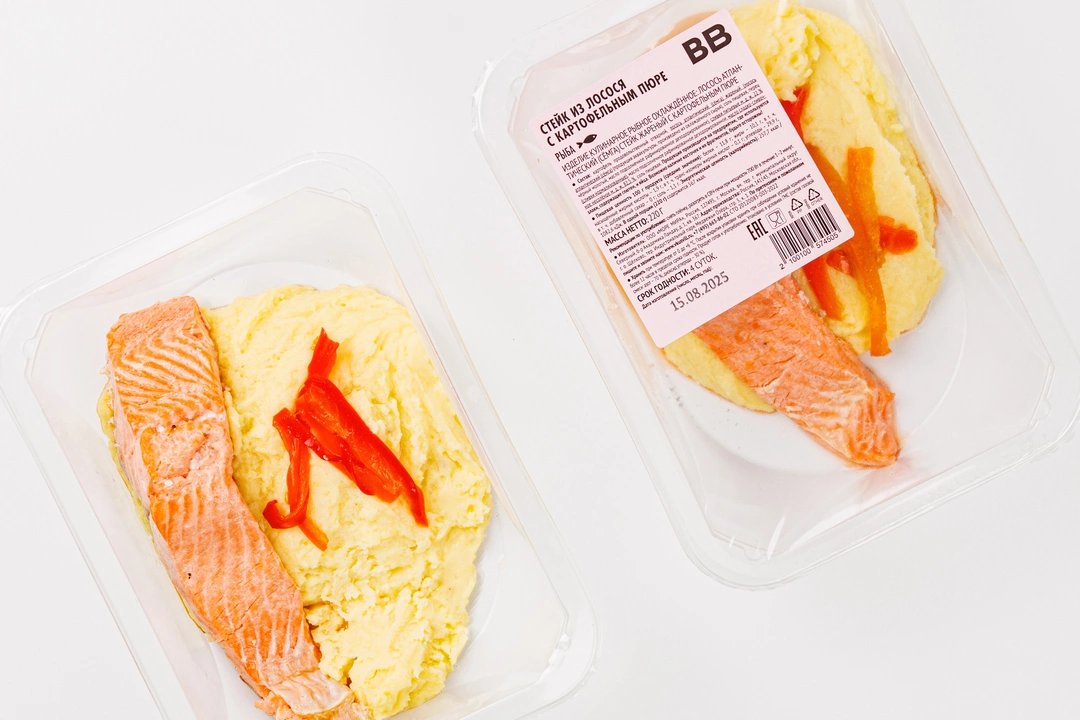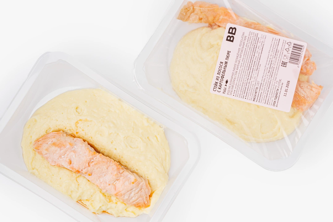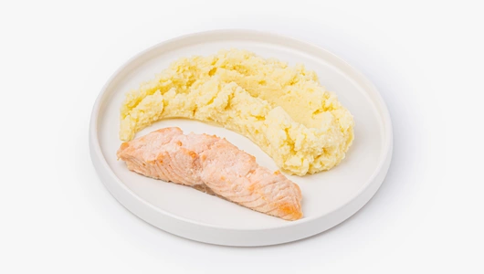 Сбалансированное блюдо из обжаренного стейка сёмги и нежного картофельного пюре, которое приготовили с добавлением сливок и сливочного масла. Без ароматизаторов, консервантов и усилителей вкуса