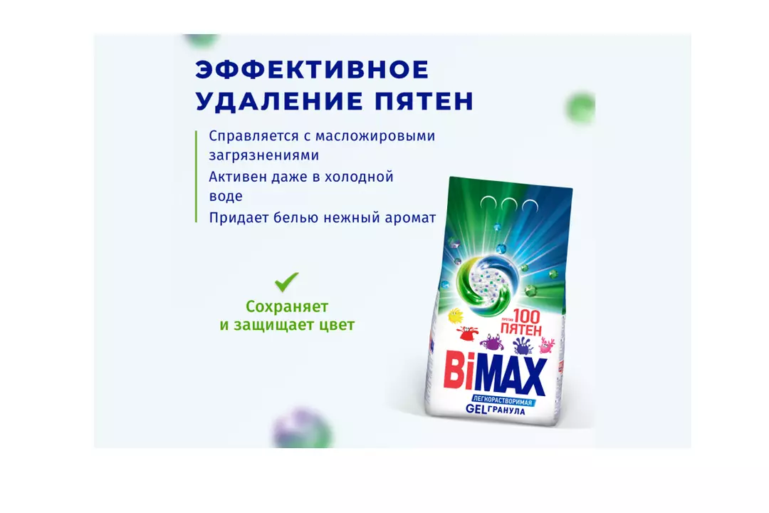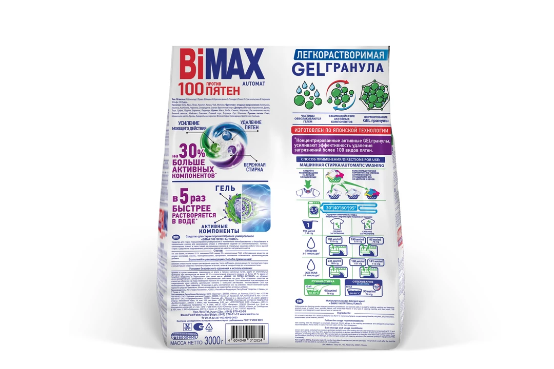 Стиральный порошок BiMAX 100 пятен предназначен для стирки белых и светлых изделий из любых видов тканей. Специальная формула порошка распознает и удаляет более 100 видов пятен, при этом ткань всегда выглядит новой и свежей. 100 пятен - одно решение, 5 действий в 1 средстве для стирки: удаляет пятна, делает цвета ярче, антибактериальный эффект, предотвращает запах сырости и смягчает ткань. Вам больше не придётся выбрасывать испорченную стирками одежду,стиральный порошок эффективно удаляет загрязнения, не повреждая волокна ткани, препятствует образованию катышков и поддерживает внешний вид изделий. Порошок быстро рассасывается в воде и не остаётся на одежде, выполаскивается из волокон ткани на 100%
