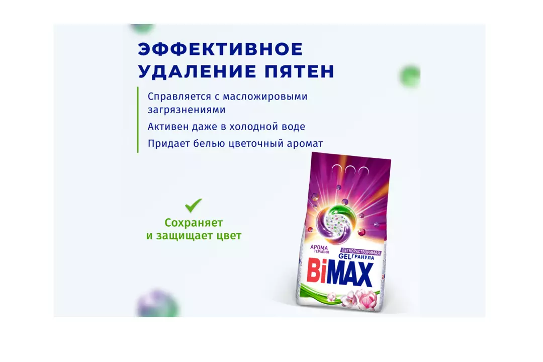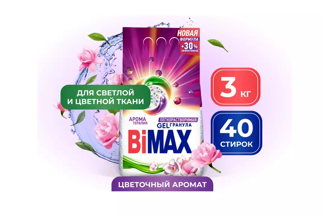 Порошок стиральный BiMAX Ароматерапия - это высококачественное моющее средство, созданное специально для использования в автоматических стиральных машинах.  Придает одежде свежий аромат чистоты на весь день. Мощный комплекс биодобавок гарантирует безупречный результат. Его уникальная формула обеспечивает эффективное удаление пятен и загрязнений, сохраняя при этом яркость цветов и избавляя от неприятных запахов. Одним из главных преимуществ порошка является его приятный аромат, который остается на белье даже после стирки. Благодаря стиральному порошку BiMAX Ароматерапия погрузитесь в мир эфирных масел, дарящих вдохновение для души и тела.