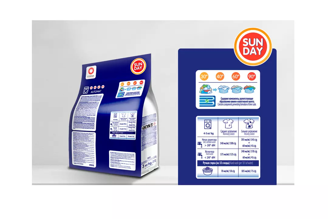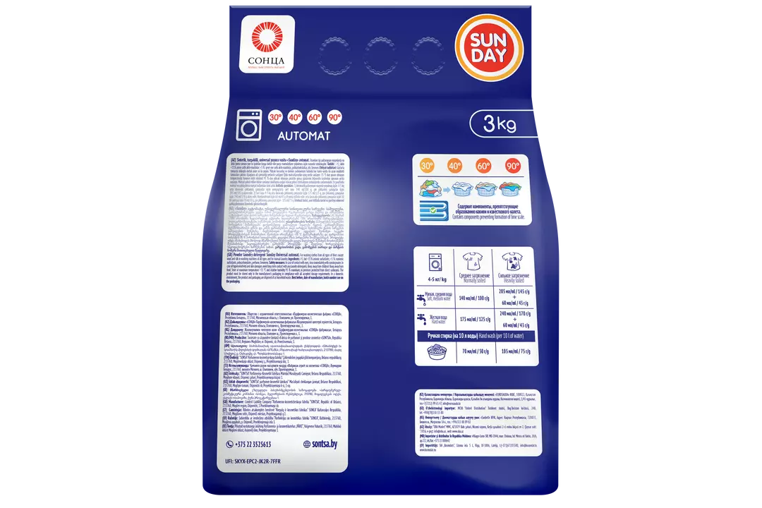 Стиральный порошок универсальный Автомат 3 кг. Sunday. Порошок с высокой моющей и отбеливающей способностью. Прекрасно справляется со всеми видами загрязнений, препятствует повторному осаждению грязи на тканях, бережно относится к структуре волокон. Страна производства- Беларусь