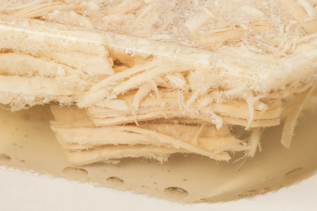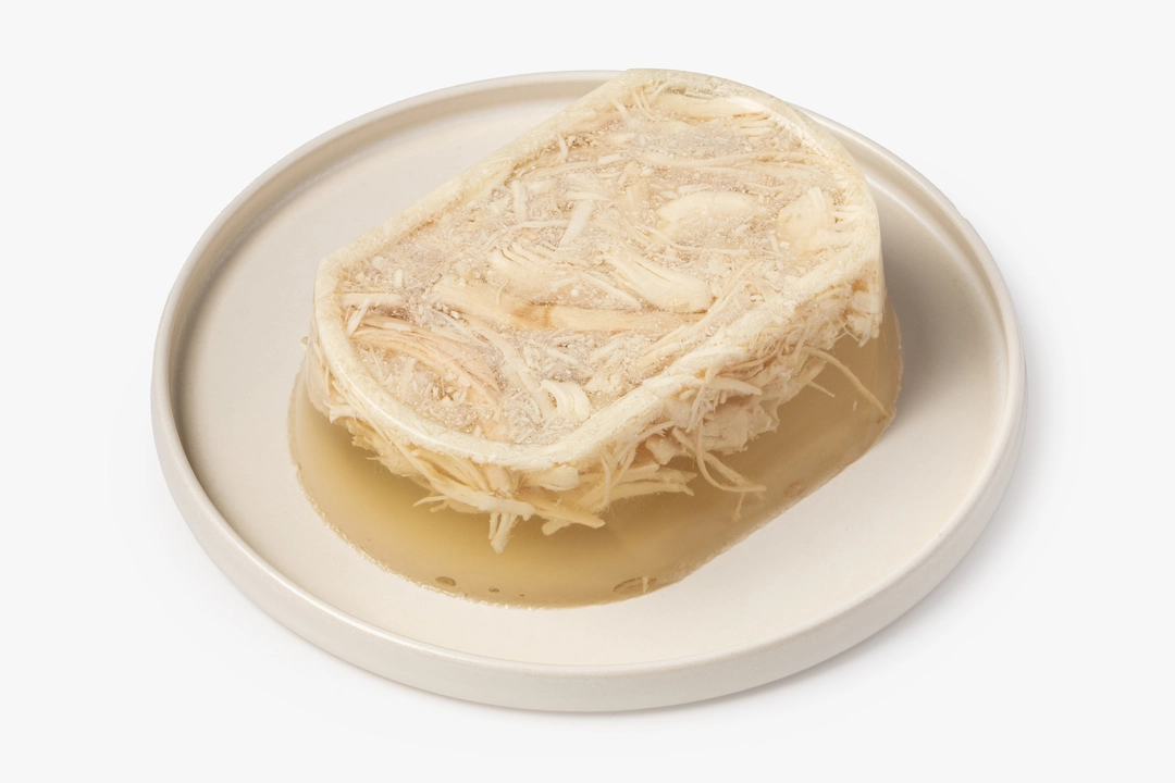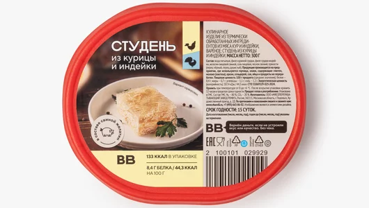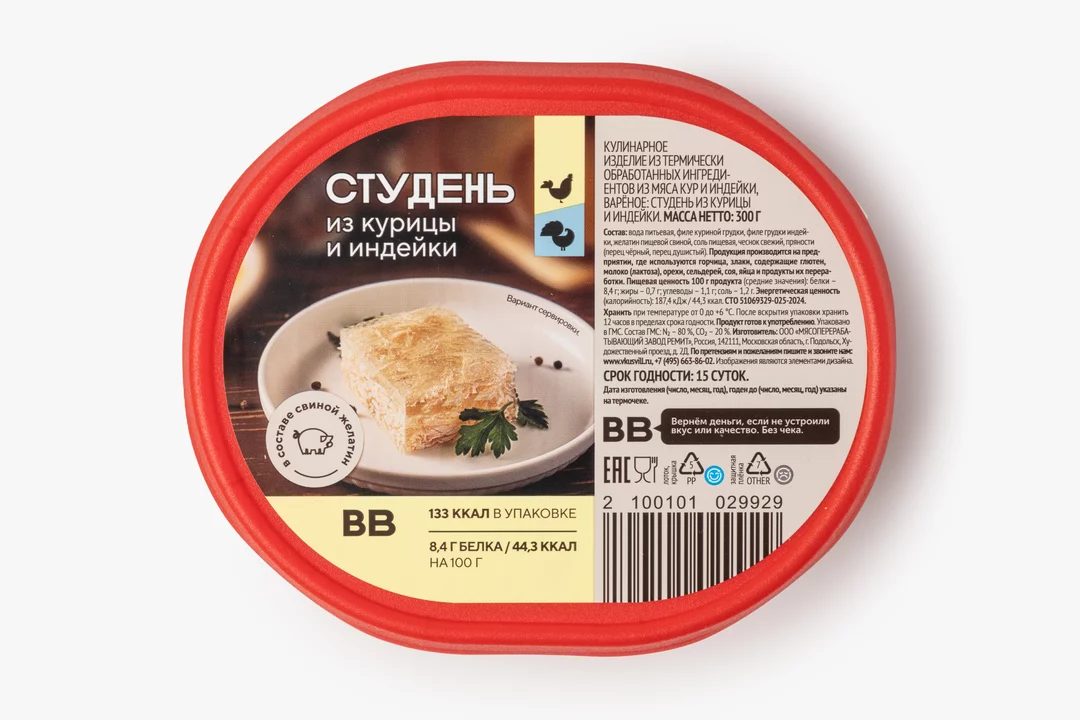 Лёгкий студень из курицы и индейки с нежной мясной прослойкой для поклонников русской кухни. Блюдо приготовлено из филе грудки птицы на свином желатине, поэтому вкус получился мягким и насыщенным. Мы добавили традиционные специи, чтобы придать студню пикантность и тёплую пряность. Продукт полностью готов к употреблению — достаточно открыть упаковку и дополнить его хреном, горчицей и свежим хлебом.