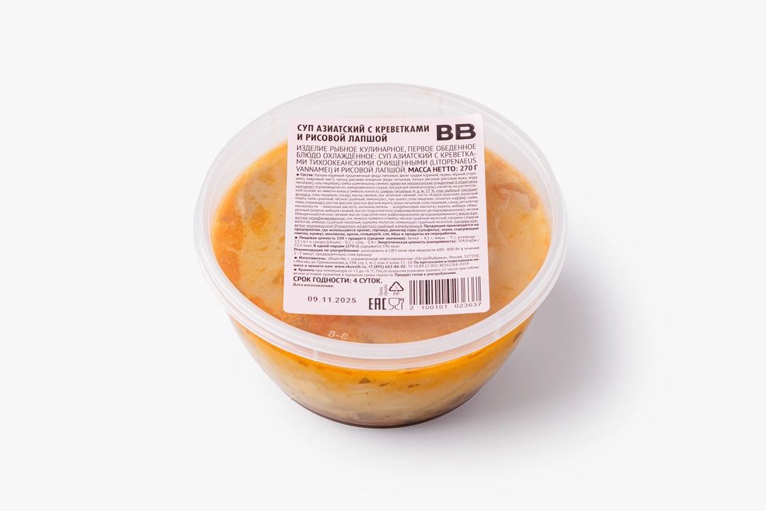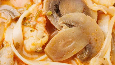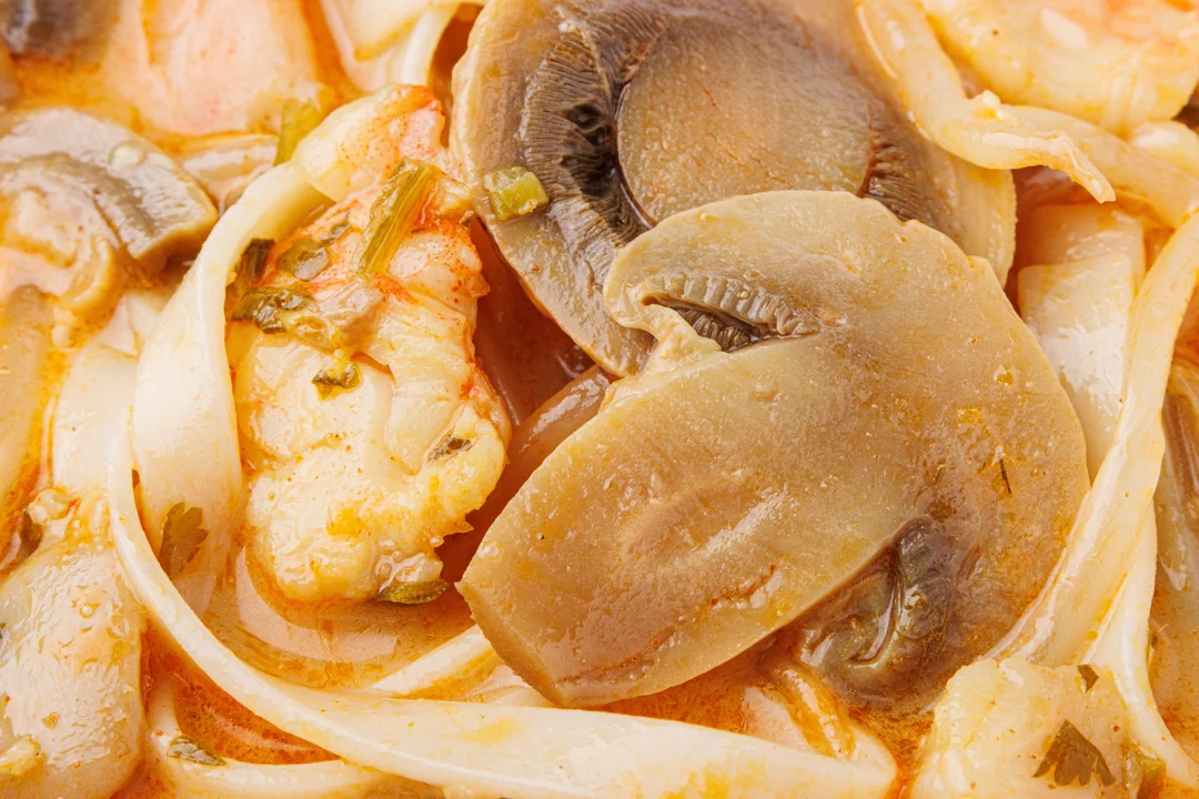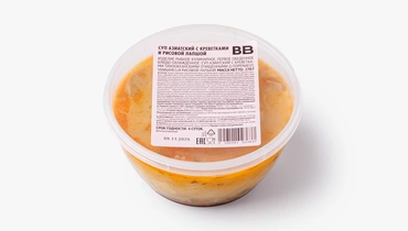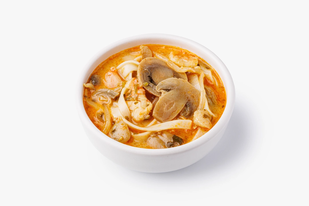 Лёгкий остро-сливочный суп в азиатском стиле с креветками и рисовой лапшой. Прозрачный куриный бульон становится насыщеннее благодаря кокосовой основе и красной карри-пасте: вкус получается тёплым, ароматным и немного пикантным. Креветки добавляют сочность, шампиньоны и ростки фасоли — свежесть и лёгкий хруст. Рисовая лапша делает суп сытнее, а кинза, зелёный лук и капля лимона подчёркивают его яркий, живой вкус.