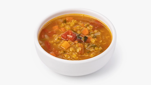 Этот аппетитный овощной суп с чечевицей, несмотря на простое название, удивит своим насыщенным пикантным вкусом. Секрет — в добавлении ароматных индийских приправ: карри и гарам масала придают блюду яркость и остроту. Такой пряный супчик точно разнообразит рацион. И ещё одно его достоинство — низкая калорийность: всего 66,7 ккал в 100 г.