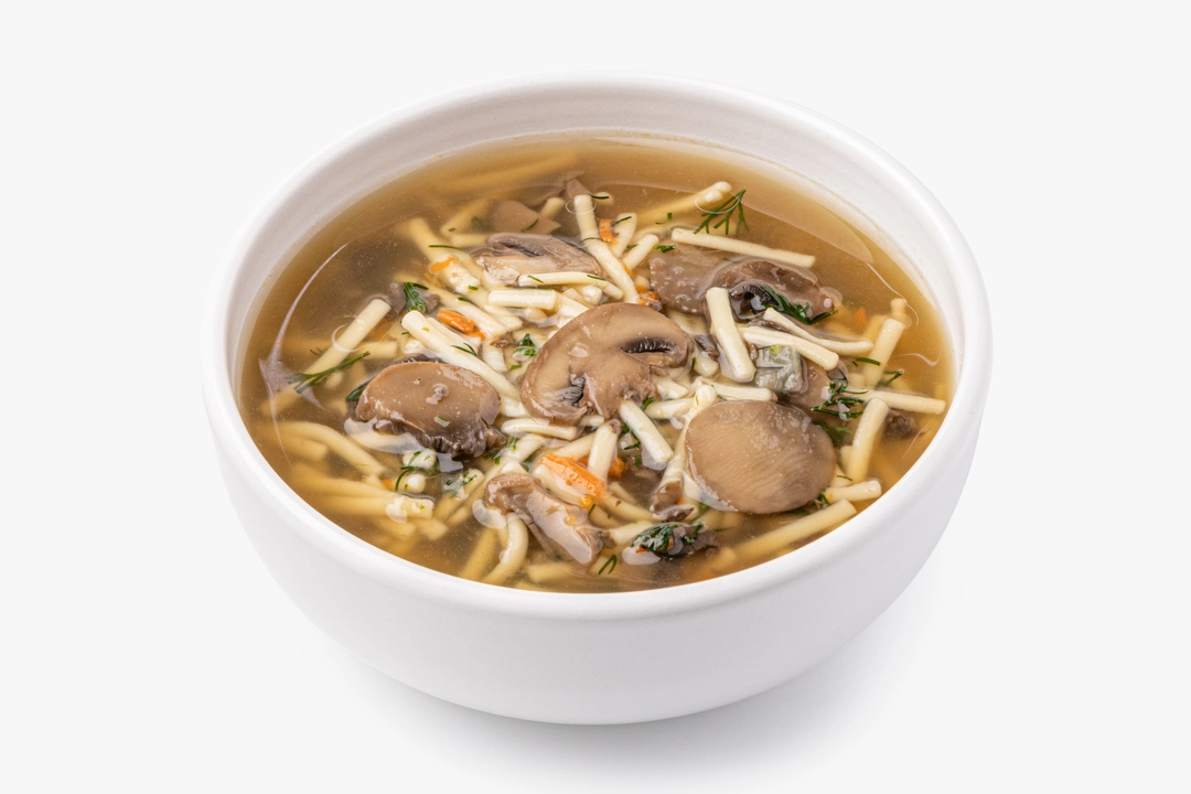 Яркий аромат, выразительный, чуть пряный вкус, много шампиньончиков и постный состав. Приготовили на насыщенном грибном бульоне с домашней лапшой и пассерованным луком.