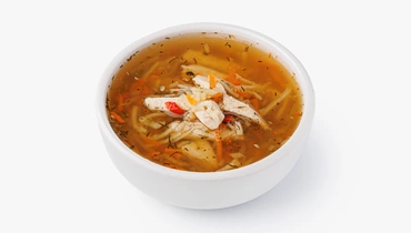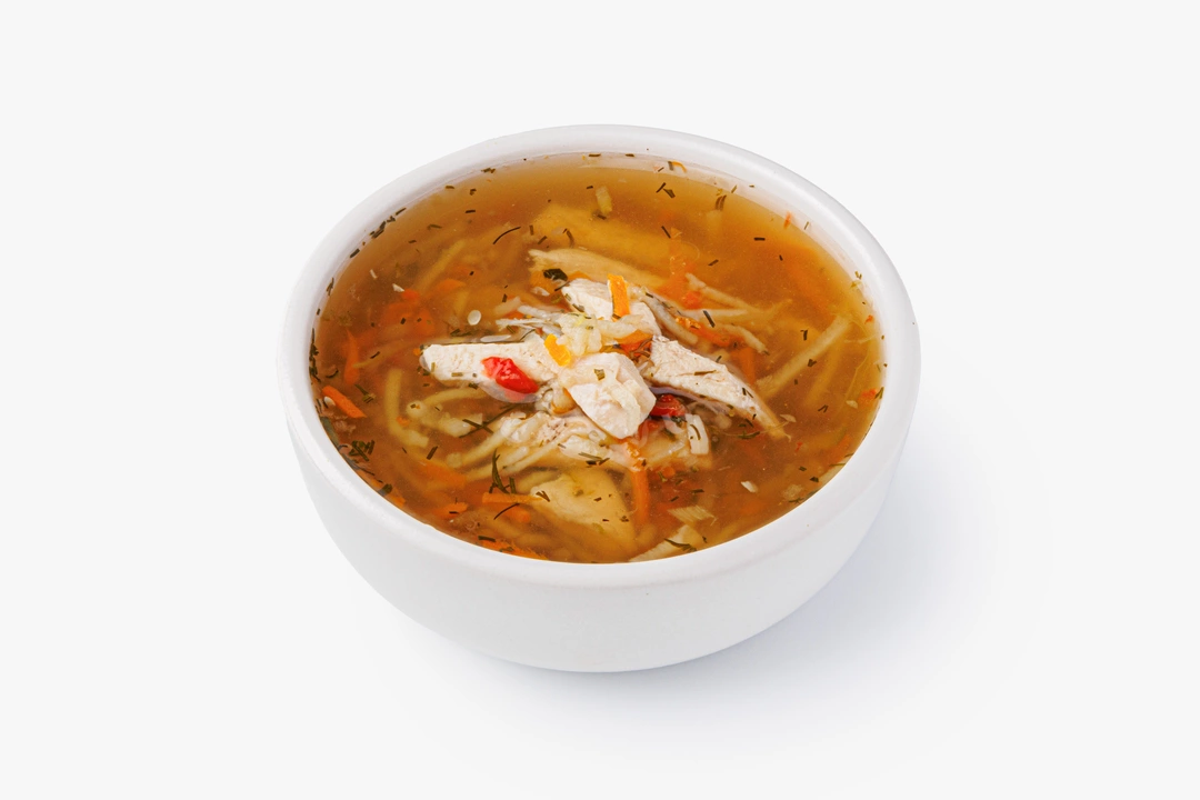 Лёгкий суп с курицей согревает и напоминает домашний обед. Мы сварили бульон и процедили его, чтобы он стал прозрачным, но сохранил свои вкусовые качества. Кусочки нежного филе делают его сытным и питательным. Вместо привычной лапши здесь тонко нарезанные овощи, добавляющие свежести, и рубленый укроп, придающий характерный аромат. Это аппетитный и вкусный обед, когда нет времени приготовить первое блюдо самостоятельно. Именно такой суп вы ели в детстве и просили добавки.