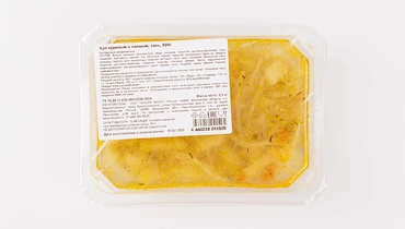 Готовим точь-в-точь как дома: на золотистом курином бульоне, с кусочками сочных бёдрышек и нежной лапшой. Не используем искусственные ароматизаторы — только лаврушку, щепотку перца и зелень, чтобы подчеркнуть вкус. Замораживаем в компактном лоточке — можно разогреть в СВЧ-печи без предварительной разморозки.