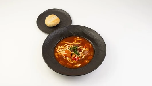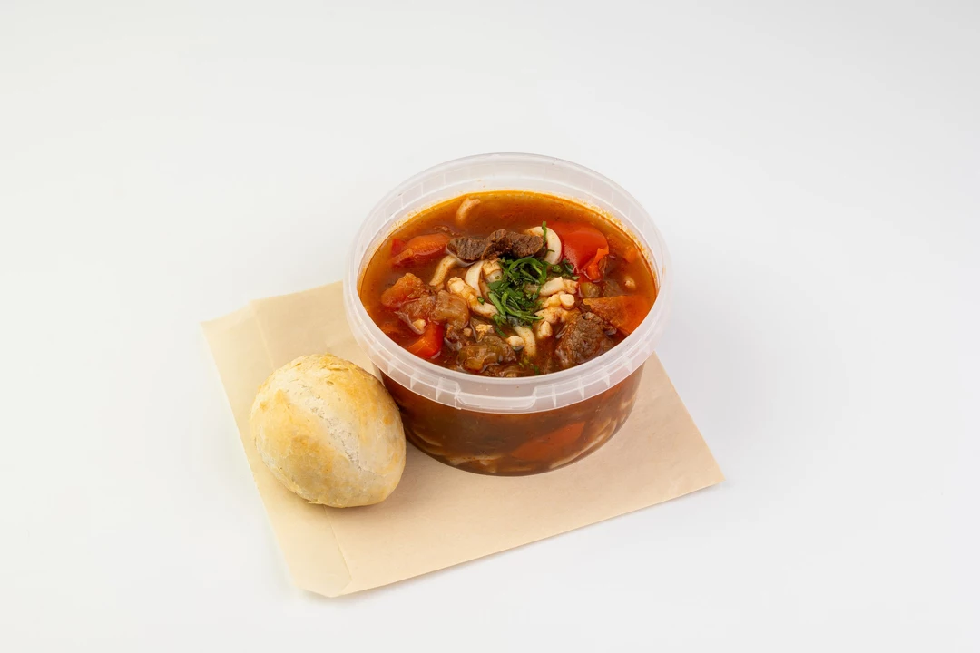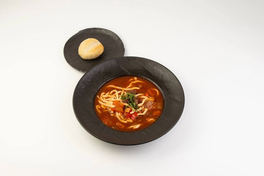 По-настоящему сытное блюдо из домашней лапши в наваристом бульоне, с говядиной, пекинской капустой, репчатым луком, сельдереем, морковью и томатами, сдобренный ароматными пряностями, душистым чесноком, перьями зеленого лука и свежей кинзой. Комплектуется с пшеничной булочкой.