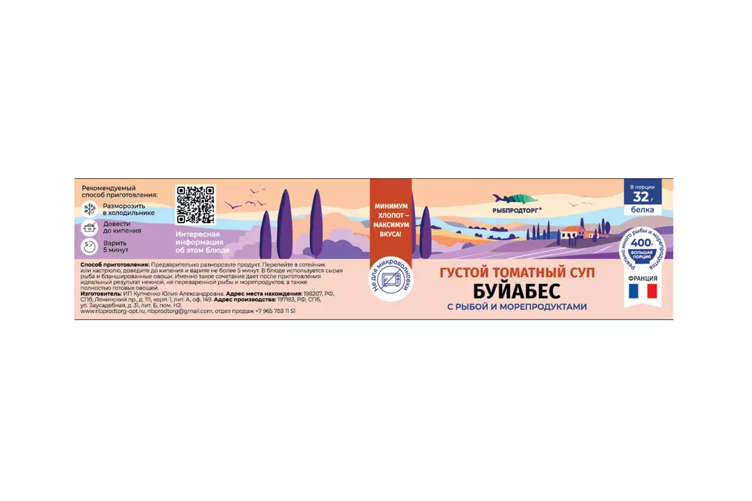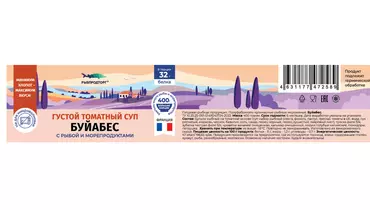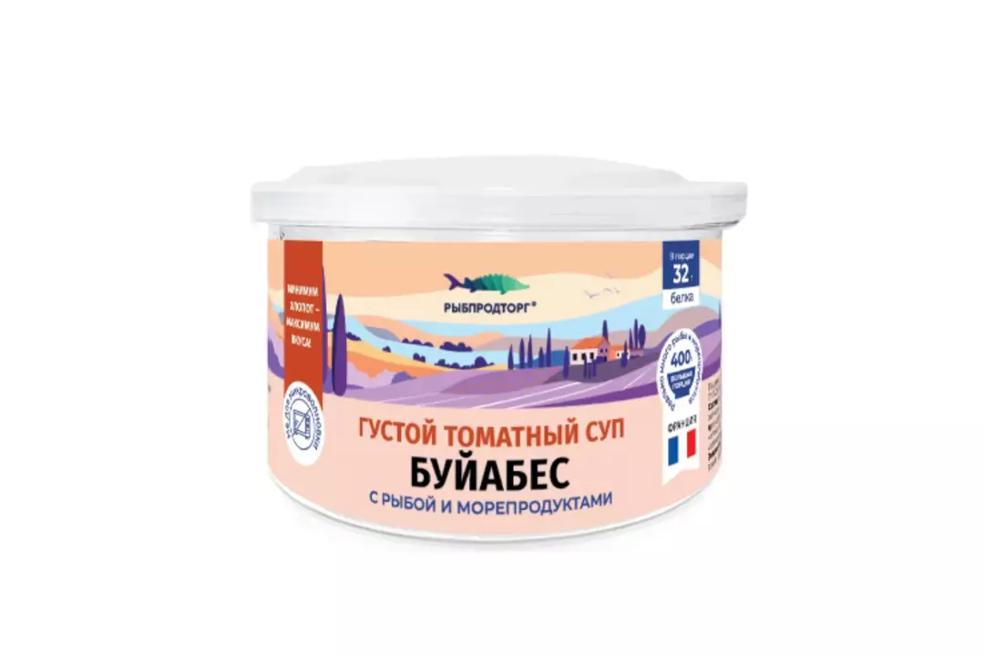 Отправьтесь в гастрономическое путешествие с нашей линейкой супов! Подарите себе атмосферу настоящего ресторана прямо у себя дома с томатным супом «Буйабес» — классическим французским рецептом на наваристом, пряном томатном бульоне. В каждом глотке вы почувствуете богатство вкусов трески, зубатки, креветок, кальмаров и чилийских мидий. Этот суп — настоящее путешествие по побережью Прованса, где свежие морепродукты сочетаются с ароматными специями и насыщенным томатным бульоном. Создайте у себя дома изысканный ужин и окунитесь в атмосферу французской кухни! Страна-производитель Россия
