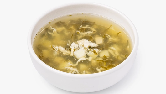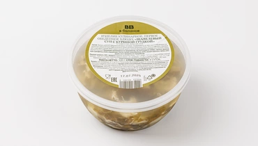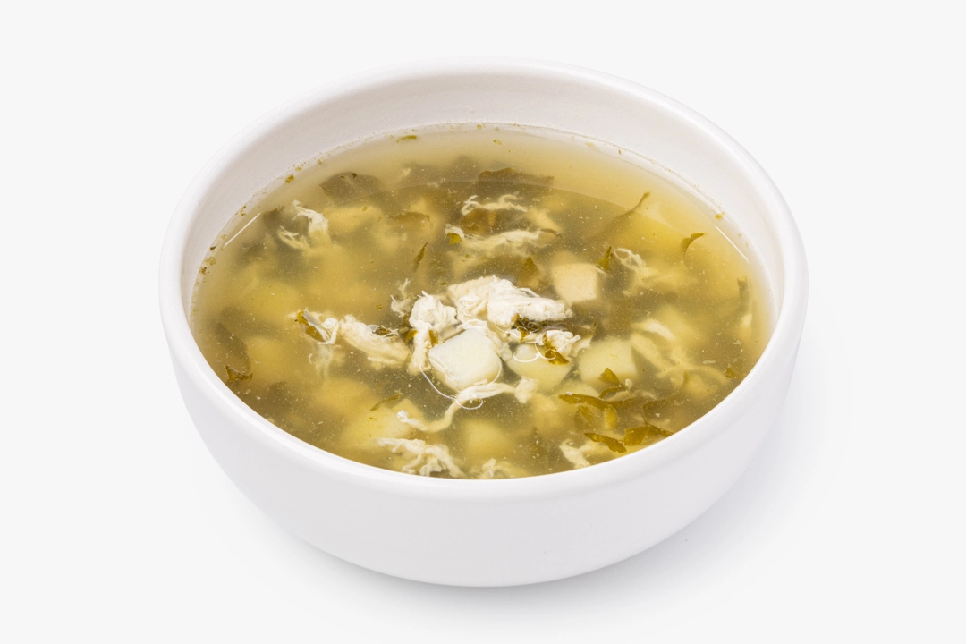 Лёгкий низкокалорийный суп. Сварен на курином бульоне, с куриным филе, картофелем и щавелем, который придаёт блюду кислинку. Вбитое яйцо образует аппетитную паутинку на супе и делает его сытнее. Разогреть можно прямо в упаковке. Советуем подавать со сметаной.