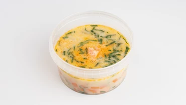 Ароматный суп, который сочетает в себе нежный лосось, сладкую морковь, репчатый лук и кремовую текстуру сливок, с добавлением веточки свежей зелени петрушки.