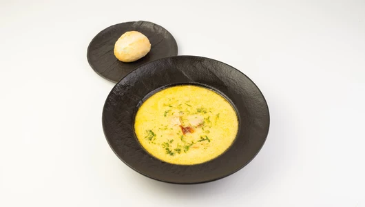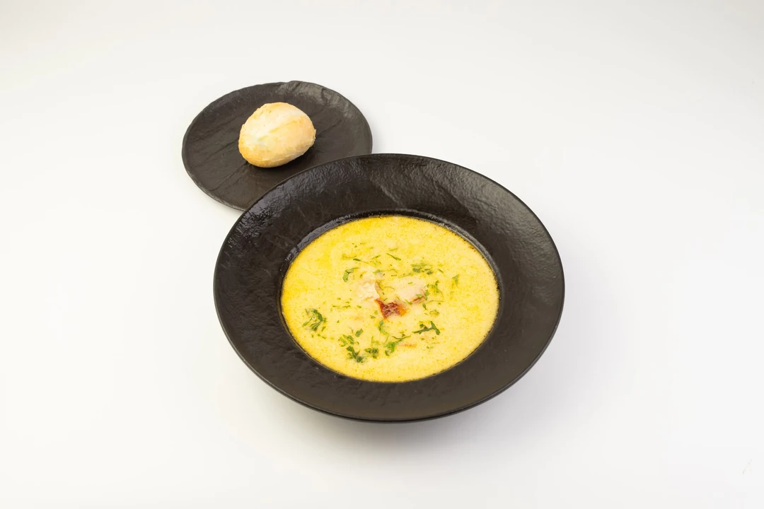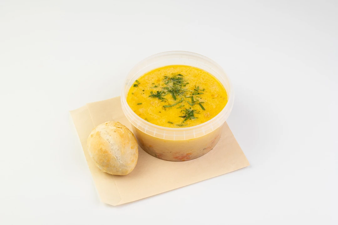 Ароматный суп, который сочетает в себе копченый сом, сладкую морковь, репчатый лук и кремовую текстуру сливок, с добавлением веточки свежей зелени петрушки. Комплектуется с пшеничной булочкой.