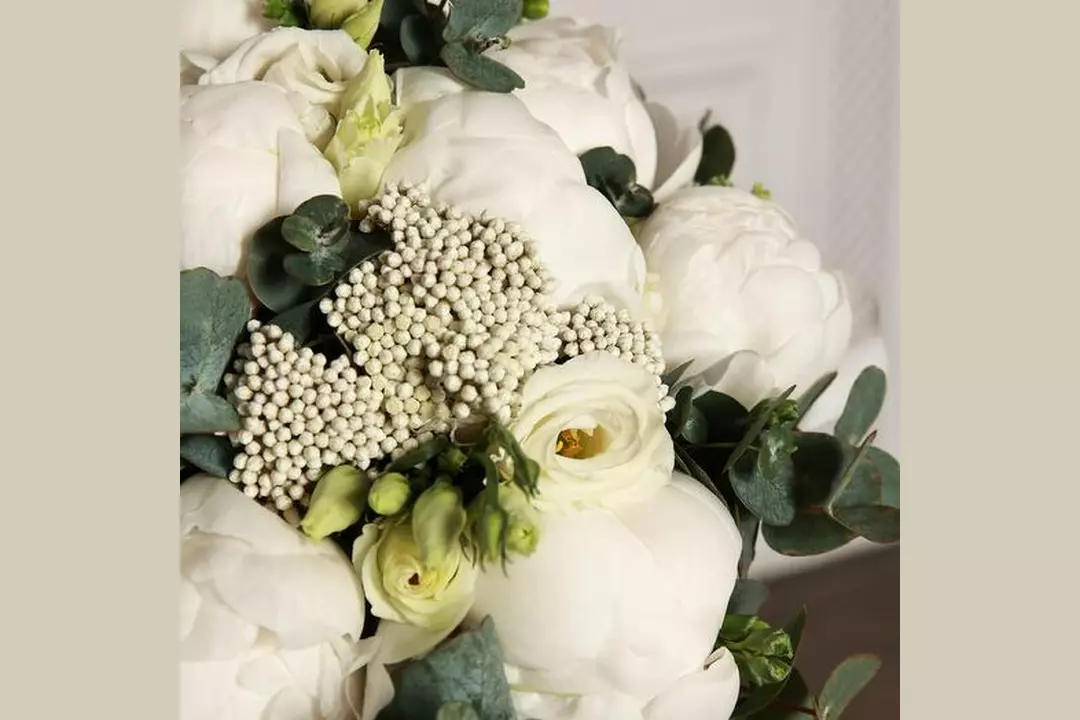 Свадебный букет из пионов, озотамнуса и эустомы