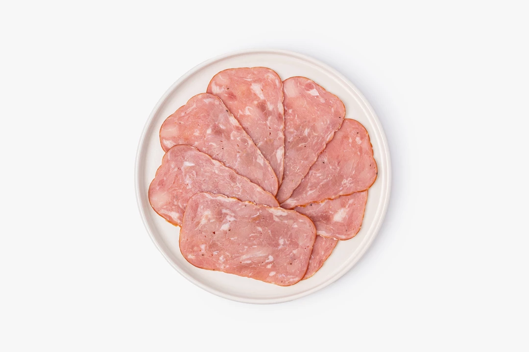Тонкая нарезка сырокопчёной свинины с насыщенным вкусом и лёгким ароматом пряностей. Мясо с плотной текстурой и деликатными нотами чеснока и пряных специй. Подходит для мясной тарелки, сэндвичей или быстрой закуски.