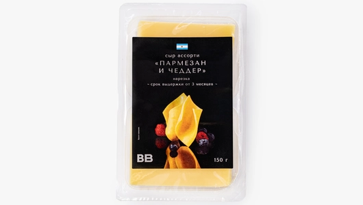 Два вида сыра в удобной нарезке. Пармезан с выдержкой от 3 месяцев отличается традиционной выраженной солоноватостью, а чеддер — насыщенным сливочным вкусом. Ломтики удобно использовать для сырной тарелки с ягодами и орехами или для сэндвичей. Массовая доля жира в сухом веществе: пармезан — 32 %, чеддер — 48 %.