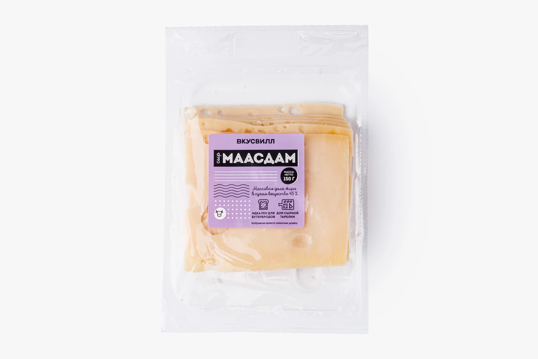 «Маасдам» отличается сладковатым, терпким, в меру островатым вкусом. Узнаваемым признаком этого сорта являются характерные круглые дырочки. Готовая нарезка ускорит приготовление бутербродов и сервировку сырной тарелки.Массовая доля жира в сухом веществе 45%.