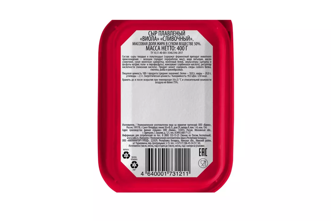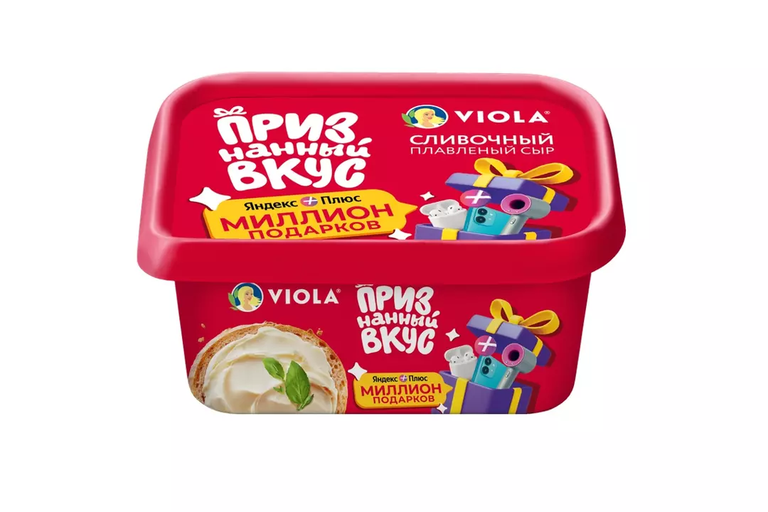Знакомый вот уже трем поколениям россиян, плавленый сыр Viola — это неизменная блондинка на упаковке и превосходный вкус внутри. Плавленый сыр Viola делается только из качественных ингредиентов по современной технологии и уникальной рецептуре, разработанной совместно российскими и европейскими технологами. C 2014 года плавленый сыр Viola в «ваннах» производится в России на собственном заводе Viola в Ершово. Для производства Viola используются твёрдые и полутвёрдые сыры, сливочное масло и настоящие наполнители (грибы, зелень, колбаса, бекон, креветки). Именно поэтому он получается таким вкусным и особенно сливочным. Благодаря своему неизменно высокому качеству и вкусу, плавленый сыр Viola вот уже шесть раз становился обладателем почетной премии «Товар года». Плавленый сыр в «ванночках» идеален для приготовления сырных супов, соусов и других блюд, требующих температурной обработки. Интересную сырную нотку плавленый сыр придаст, если его использовать в десертах, выпечке и даже напитках. Страна производитель-Россия