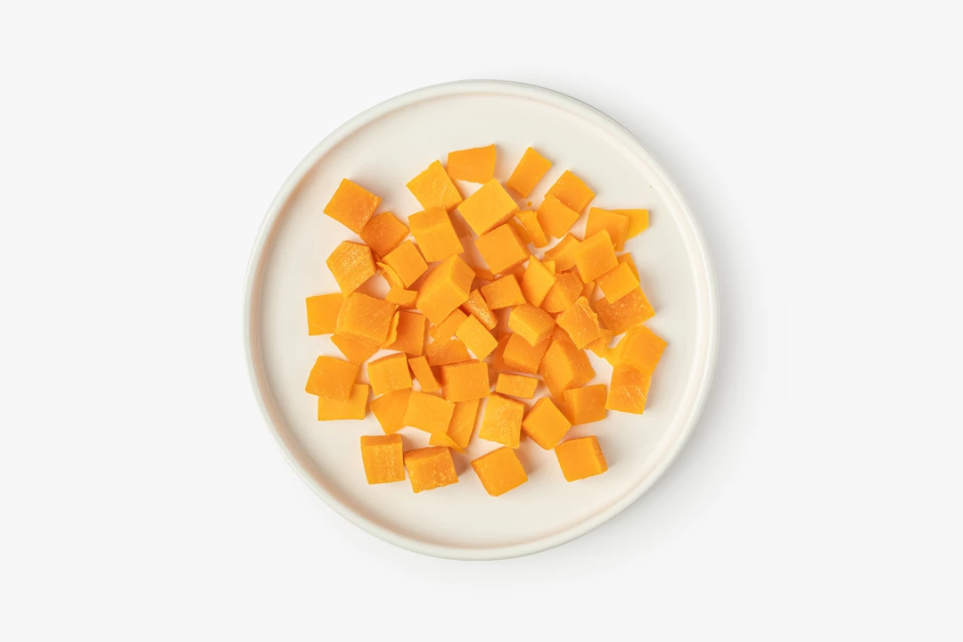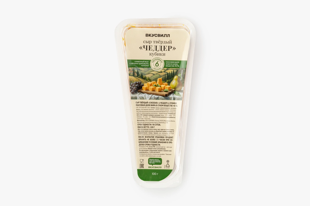 Аккуратные кубики выдержанного чеддера с ярким, чуть островатым вкусом и характерной сливочной глубиной. Их удобно выложить на сырную тарелку, дополнив виноградом, орехами или крекерами. Сырные кубики также хорошо сочетаются с фруктами и мёдом. Массовая доля жира в сухом веществе 40%.