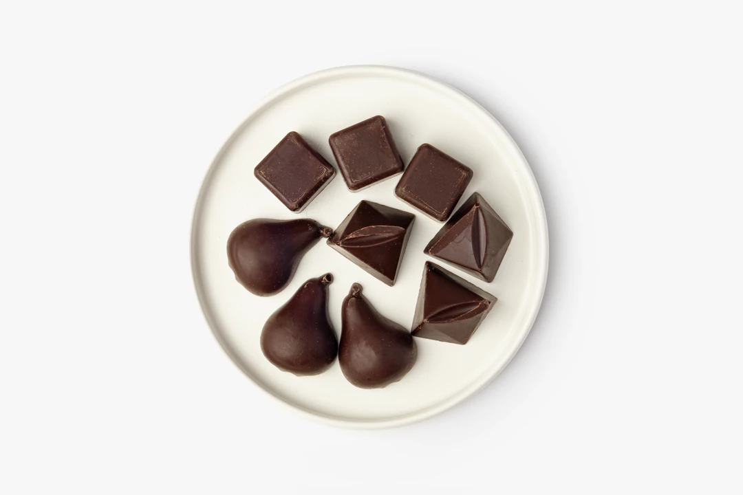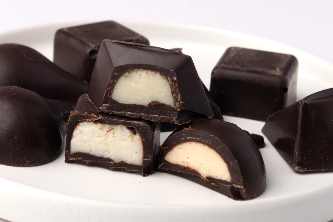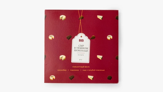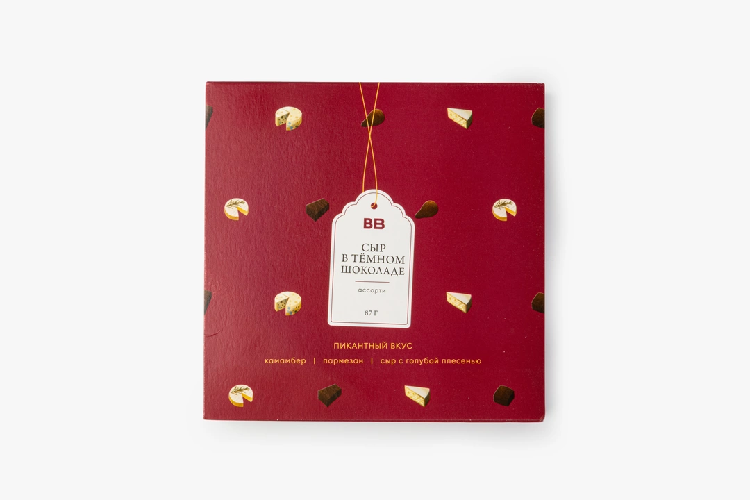 Необычное ассорти из трёх видов сыров в шоколадном корпусе. Солоноватые и ореховые оттенки пармезана гармонично сочетаются с горчинкой тёмного шоколада. Камамбер с белой плесенью обладает нежной кремовой текстурой с грибными нотами, а шоколад придаёт его вкусу глубину. Для сыра с голубой плесенью характерна пикантная терпкость, которая интересно контрастирует со сладкой оболочкой. Этот изысканный десерт можно подавать к напиткам или к фруктовой нарезке. Он станет украшением праздничного стола или приятным сюрпризом для ваших близких.