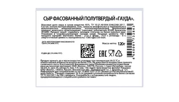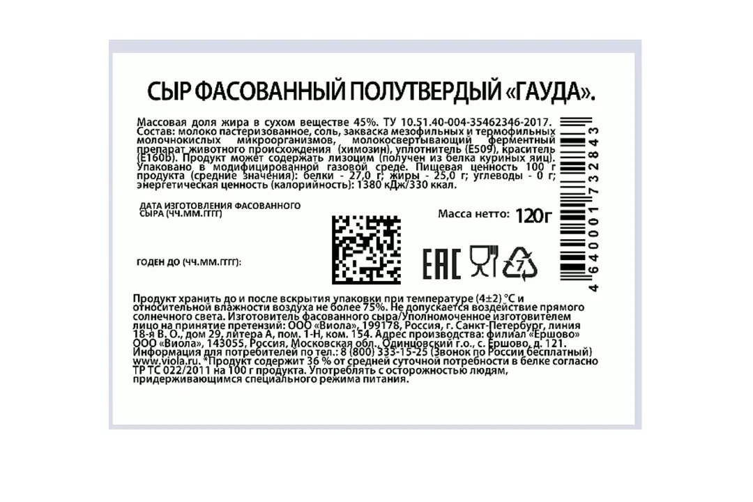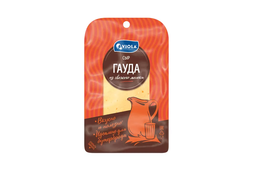 Сыр Гауда получил свое название в честь маленького портового городка в Голландии, где его производство началось еще VI веке. Viola «Гауда» относится к «Сырной коллекции» сыров Viola. Настоящему сыру этого сорта свойственны твердая консистенция с рисунком из равномерно распределенных небольших «глазков» и бледно-желтый цвет. Viola «Гауда» изготавливается на собственном заводе Viola в п. Ершово Московской области, из сырья высочайшего качества, соответствующего всем российским и корпоративным стандартам качества компании. Viola «Гауда» — это натуральный продукт, который не содержит растительных заменителей жира. Как и всякий натуральный сыр, это источник кальция и фосфора, которые необходимы для поддержания здоровья костей и нормализации работы головного мозга, а также молочного протеина, который поддерживает работоспособность мышц. Вкус сыра «Гауда» варьируется от нежного и мягкого орехового до насыщенно пряного с характерной сладостью. У молодого сыра вкус мягкий, однако со временем зрелый сыр приобретает более ярко выраженный вкус. Этот сорт сыра подойдет для бутербродов и сэндвичей. Незаменимым «Гауда» является и в кулинарии, где требуется температурная обработка блюд с тертым сыром. Сыр Viola «Гауда» в нарезке весом 120 г представлен в удобной упаковке с системой многократного открывания и закрывания. Страна производитель-Россия