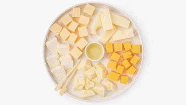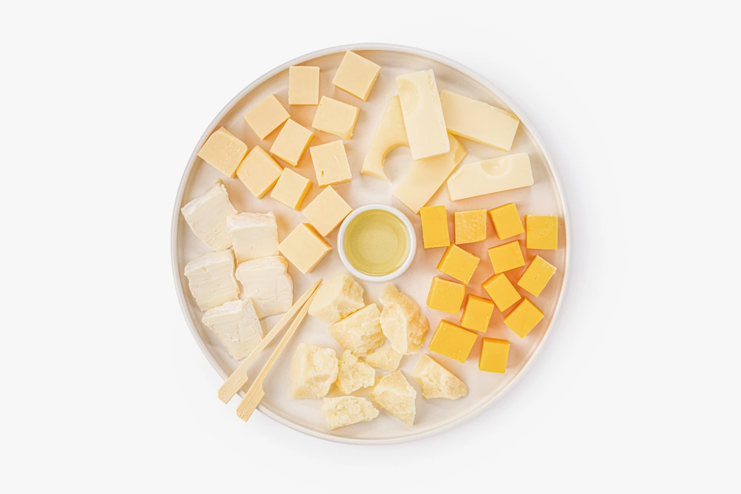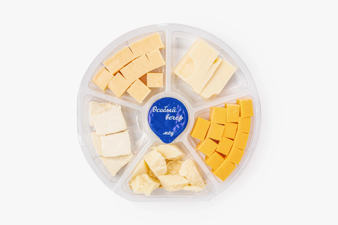 Ассорти объединяет пять видов сыра. Камамбер с белой плесенью известен своей нежной кремовой консистенцией и грибными нотами. Пармезан отличается суховатой текстурой и солоноватостью. Красный чеддер имеет плотный вкус с лёгкой остринкой, маасдам с характерными «глазками» — заметную сладость, а гауда — мягкий сбалансированный вкус без резких или острых оттенков. Дополнили сырную тарелку цветочным мёдом, чтобы подчеркнуть разнообразие вкусов, а две бамбуковые вилочки в комплекте позволят сразу приступить к дегустации.
