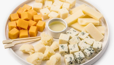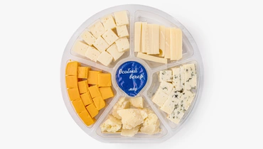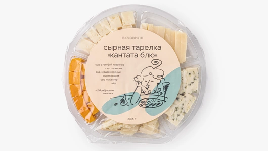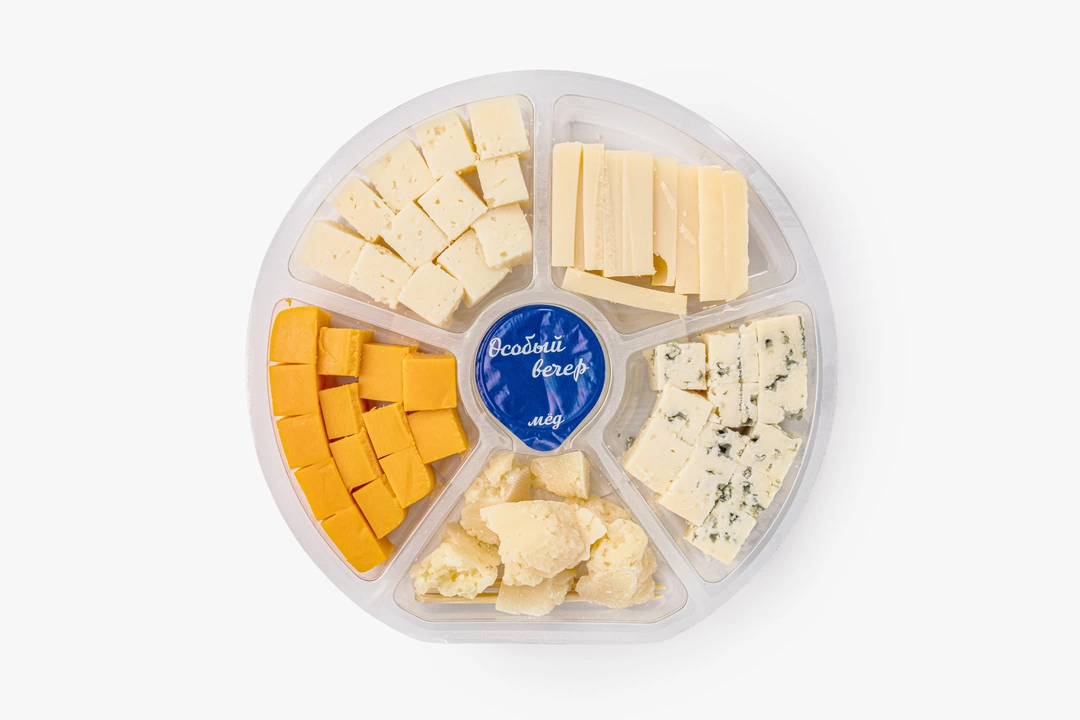 Ассорти объединяет пять видов сыра. Сыр с голубой плесенью известен своей выраженной пикантностью. Пармезан отличается суховатой текстурой и солоноватостью. Красный чеддер имеет плотный вкус с лёгкой остринкой, маасдам с характерными «глазками» — заметную сладость, а тильзитер — более яркий молочный акцент. Дополнили сырную тарелку цветочным мёдом, чтобы подчеркнуть разнообразие вкусов, а две бамбуковые вилочки в комплекте позволят сразу приступить к дегустации.