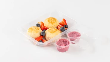 Классические сырники из свежего творога, украшенные свежим ягодным ассорти. Чтобы ярче раскрыть их молочный, с деликатной сладостью вкус мы выбрали особый авторский топпинг: сгущёнку, взбитую с бруснично-медовым соусом. Она делает текстуру сырников ещё нежнее и добавляет их звучанию ненавязчивую терпкость. Бережно упакуем сырники в термосумку и привезём их горячими домой или в офис.