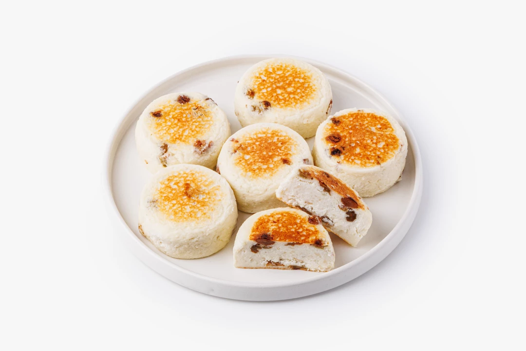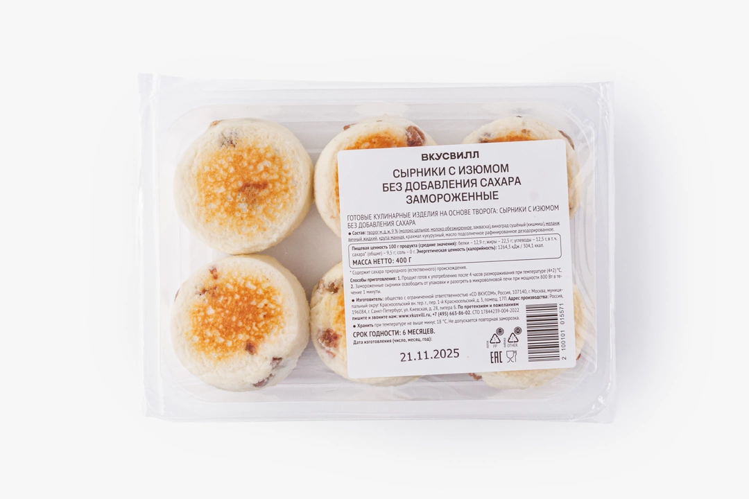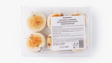 Мы приготовили нежные и пышные сырники с изюмом из творога жирностью 9% и заморозили их. Десерт без добавленного сахара получается лёгким, с молочным вкусом, который мягко оттеняет сладость кишмиша. Сырники хороши для завтрака или полдника — они не слишком сладкие, но достаточно сытные. Их можно подавать со сметаной, ягодным соусом или мёдом, разморозив или разогрев по инструкции, указанной на упаковке. Продукт не содержит искусственных ароматизаторов.