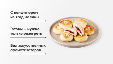Готовые сырники, которые нужно только разогреть. Используем свежий творог и конфитюр на основе замороженной малины. Состав проверен: без искусственных ароматизаторов