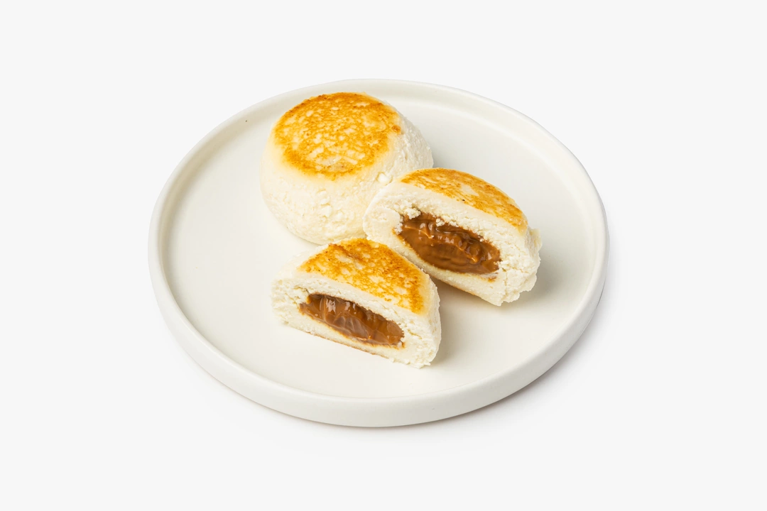 Пышный творожный десерт со сгущённым молоком внутри — это необычная вариация, напоминающая сырники и пончики одновременно. Мы приготовили его из творога жирностью 9% и добавили начинку из цельного варёного сгущённого молока, чтобы она получилась густой и карамельной. Подогрейте сырники любым удобным способом, чтобы наполнитель пропитал каждый кусочек, а творожная основа стала ещё более нежной. Это лакомство не требует дополнительных топпингов или соусов. Подавайте его с ароматным чаем или горячим какао, чтобы вновь окунуться в атмосферу детства.
