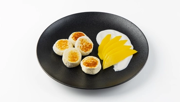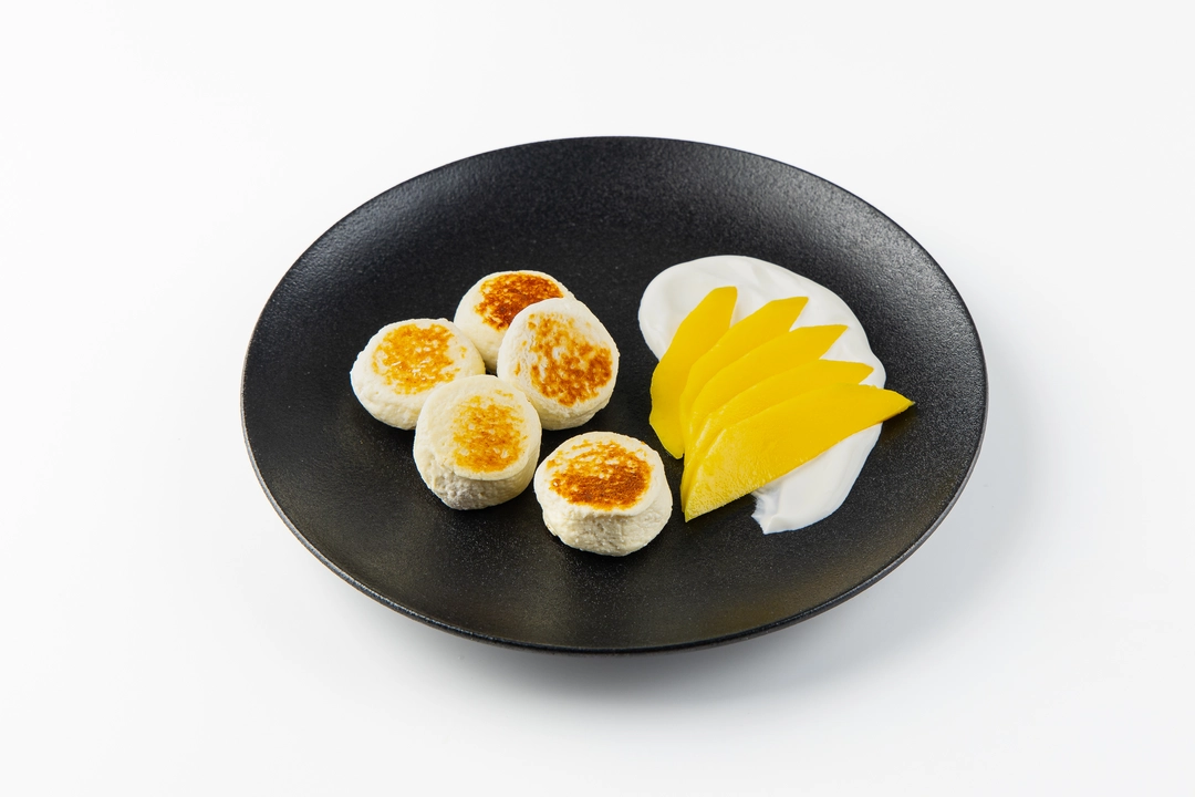Небольшие румяные сырники сочетаются с дольками свежего манго и ложкой густой сметаны. Её кремовая текстура мягко дополняет композицию, слегка смягчая яркую фруктовую кислинку. Вкус получается многослойным: нежная сладость творога, лёгкая кислинка сметаны и тропическая сочность манго. Такое блюдо хорошо подходит для неспешного завтрака или сладкого перекуса днём.