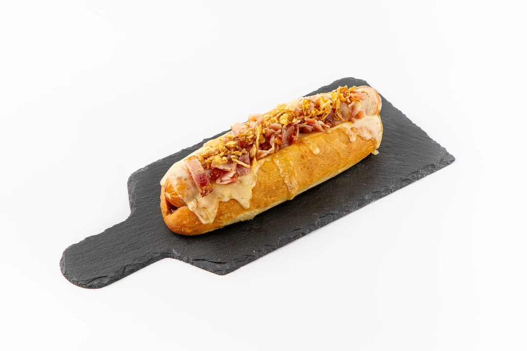 Сосиски с сыром в мягкой булочке для хот-дога — аппетитный и сытный перекус. Добавили ещё соус барбекю с копчёными нотами паприки и лёгкой остротой, тёртый сыр, хрустящие маринованные огурчики и ароматный жареный лук. Копчёный бекон добавляет солоноватый акцент и завершает композицию. Хот-дог приедет горячим, чтобы вы могли сразу ощутить сочетание нежной куриной сосиски, тягучего сыра и пикантного соуса с приятной текстурой огурцов и лука.