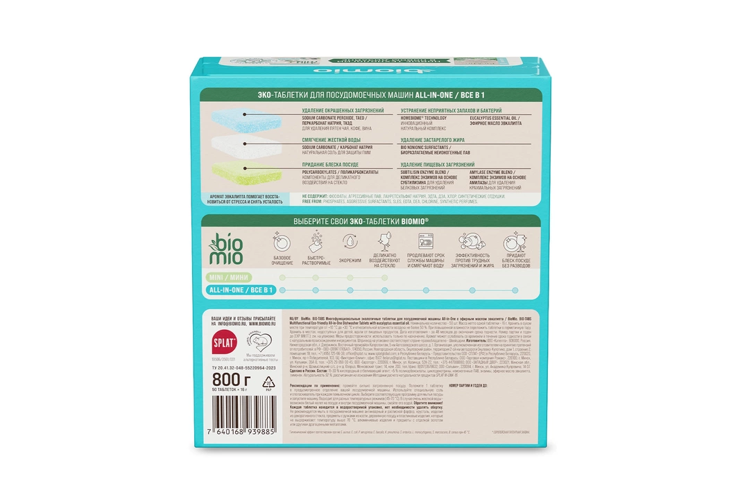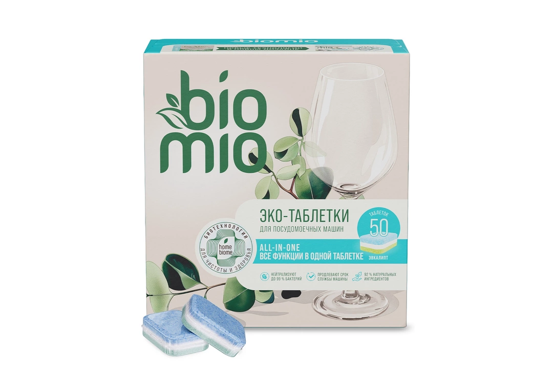 Экологичные многофункциональные таблетки BioMio BIO-TABS с эфирным маслом эвкалипта для посудомоечных машин на 92% состоят из натуральных компонентов. Содержат функции соли и ополаскивателя в одной таблетке. Продлевают срок службы машины. Благодаря инновационной технологии HomeBiome в составе устраняют до 99% бактерий кишечных инфекций (от кишечной палочки до сальмонеллы) и нейтрализуют неприятные запахи. Безопасны для детской посуды, бутылочек. Биоразлагаемы, безопасны для септиков. Страна производитель-Россия