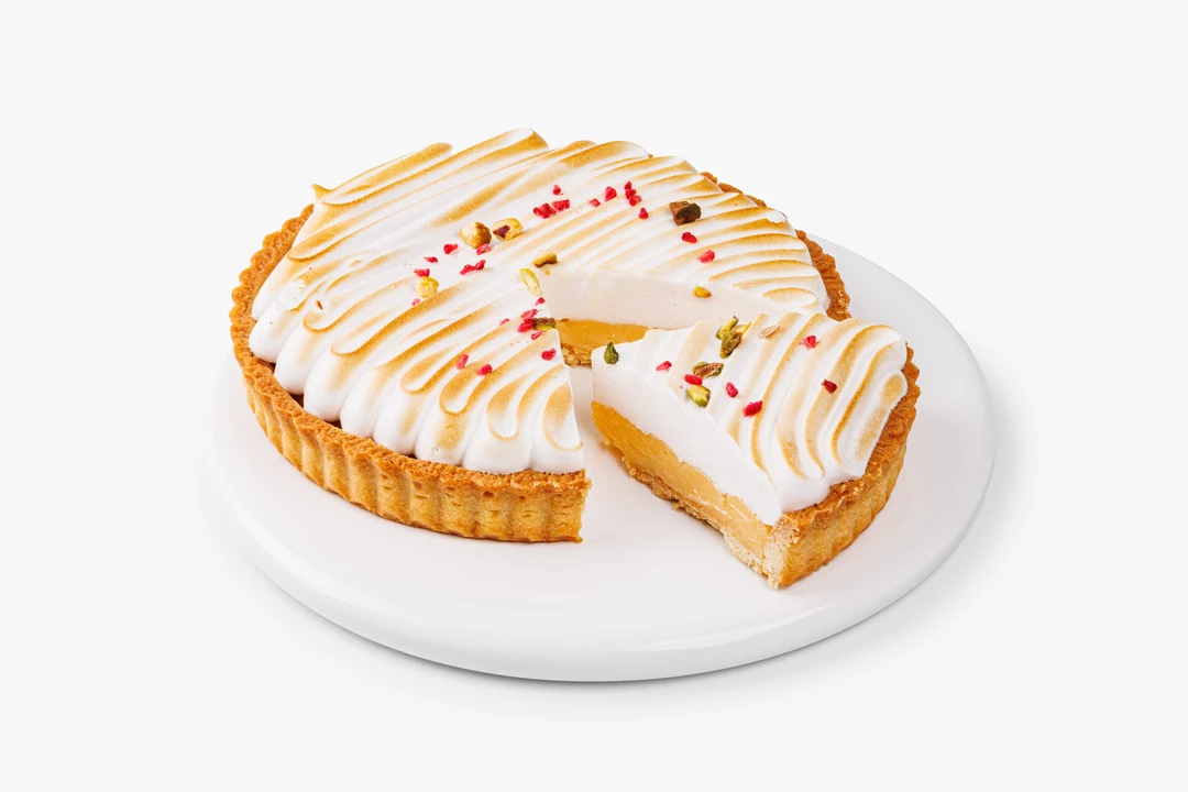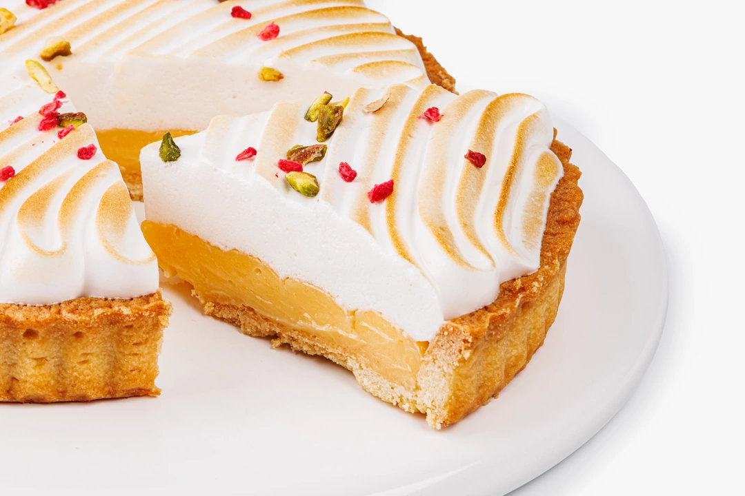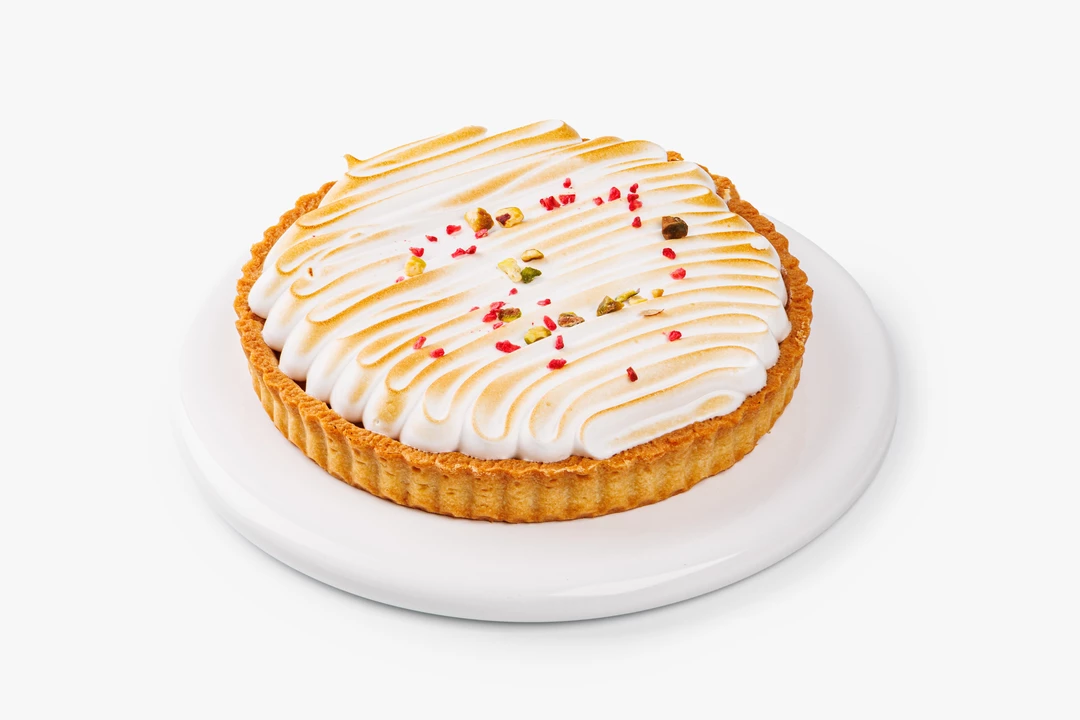 В основе тарта — классическое песочное тесто, которое сочетается с нежным лимонным кремом и воздушной итальянской меренгой. Сверху тарт украшен фисташковой крошкой и малиной.
